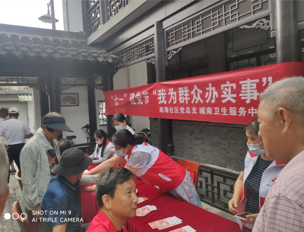 活动开始前,南海社区博爱家园在书场门口开展“4X4”我为群众办实事“现场义诊”活动,为辖区居民提供测量血压、健康咨询、慢性病用药指导、全民健康生活方式解疑答惑、流动人口健康教育等便民利民活动。