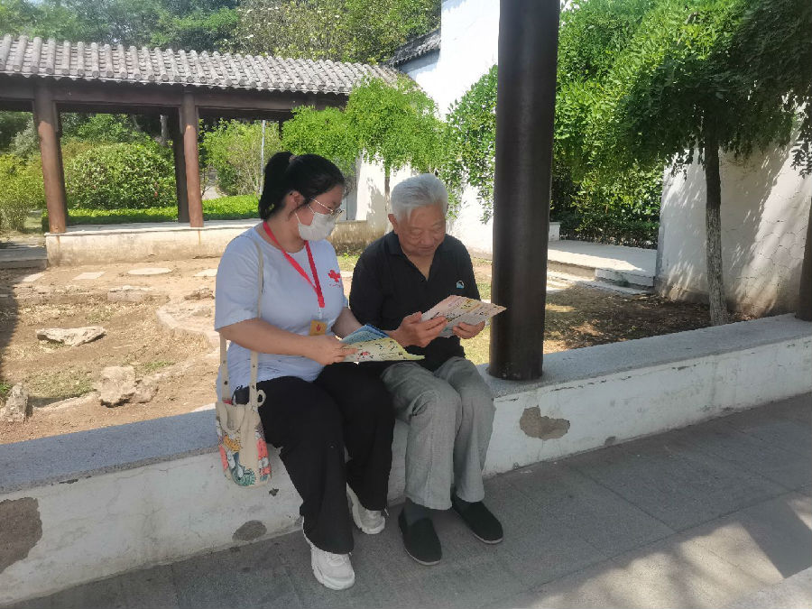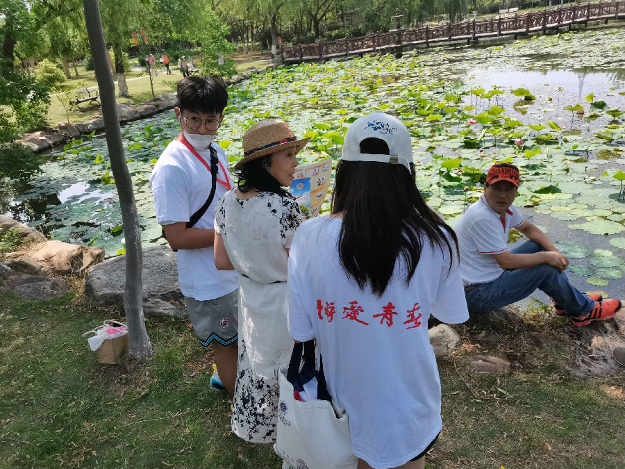 为向广大居民弘扬“人道、博爱、奉献”的红十字人道主义精神,2022年6月17日上午,江苏海洋大学外国语学院红十字会的第一组志愿者在苍梧绿园进行志愿实践宣传服务活动。