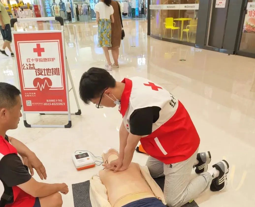 “红十字应急救护——公益夜地摊”活动利用市民晚上休息纳凉的时机,重点宣传心肺复苏、AED使用及气道异物梗阻操作技能。以“地摊”形式宣传红十字知识、传播人间大爱!今年“公益夜地摊”将继续在东台市的吾悦广场、市民广场等地举办和延续。市红十字会积极响应群众多层次需求,组织救护师资和暑期返乡大学生积极推动急救知识普及走进千家万户。