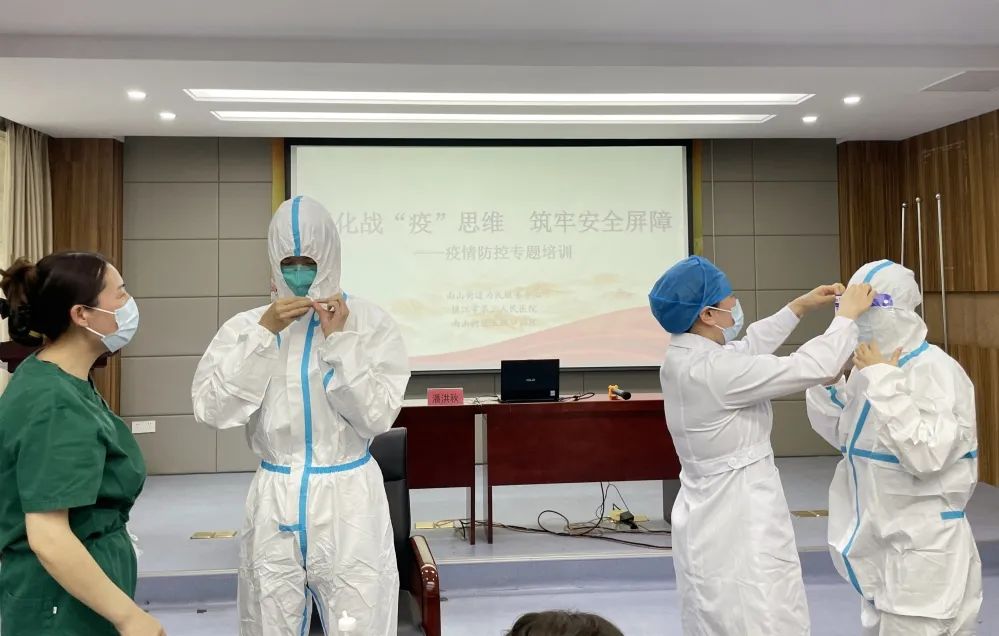 全国劳模、结核科主任潘洪秋教授给大家作PPT讲课《新型冠状病毒肺炎防治》,他从新型冠状病毒肺炎的发病机理、传染途径、临床症状、防治方法等方面详细作了介绍。随后,镇江市劳模、结核科护士长周文健及其护理团队成员为大家现场演示如何正确穿脱防护服。最后,每个社区派代表上台学习正确的手卫生操作和穿脱防护服,并由周文健护士长团队一对一进行指导。