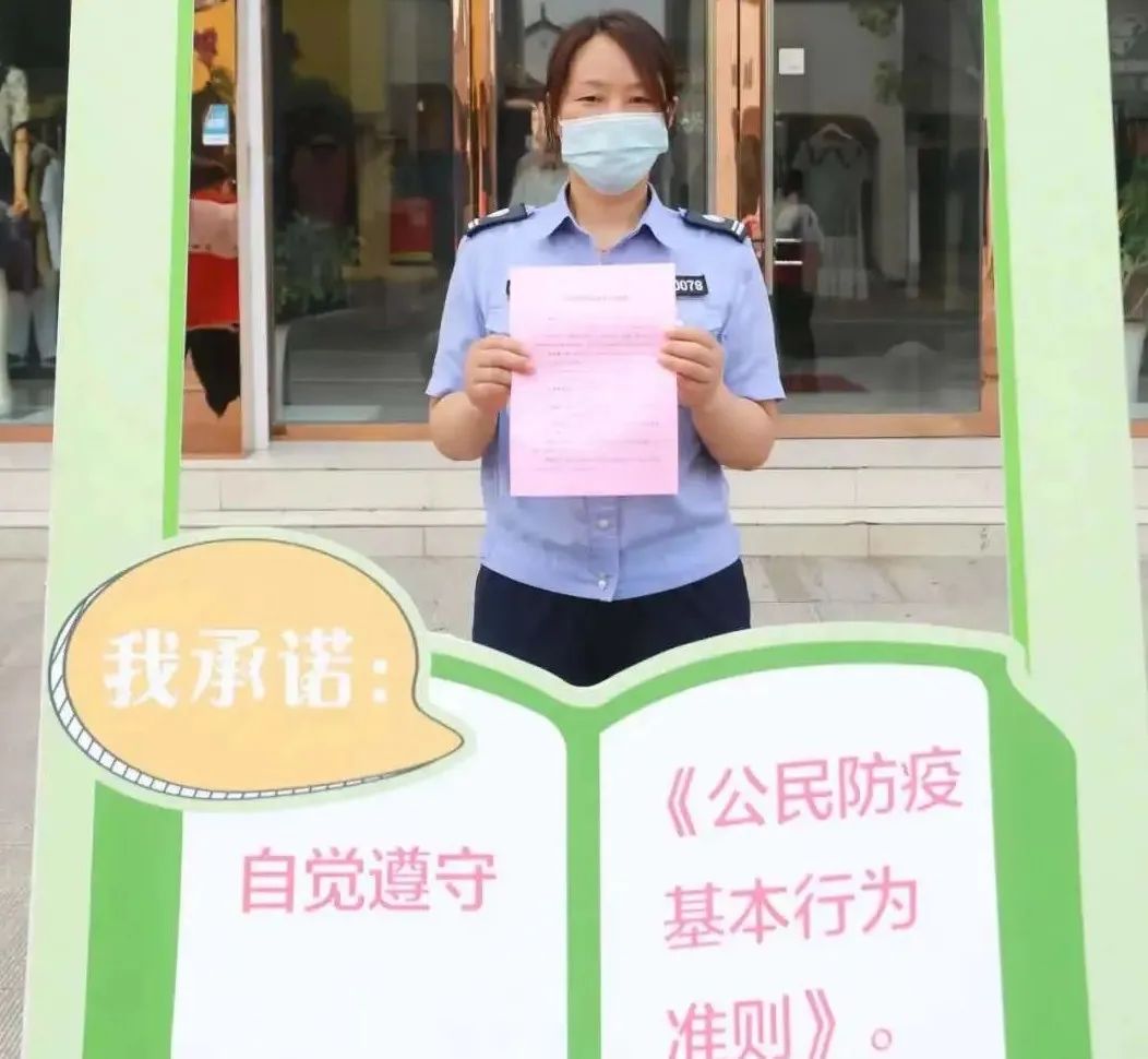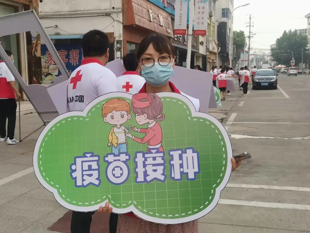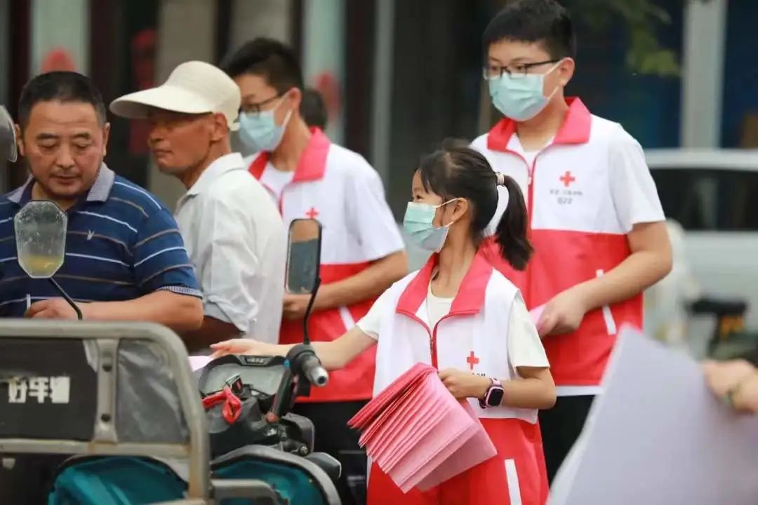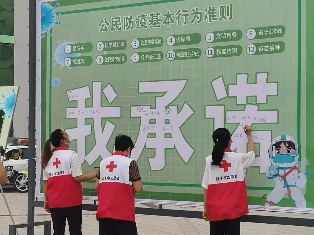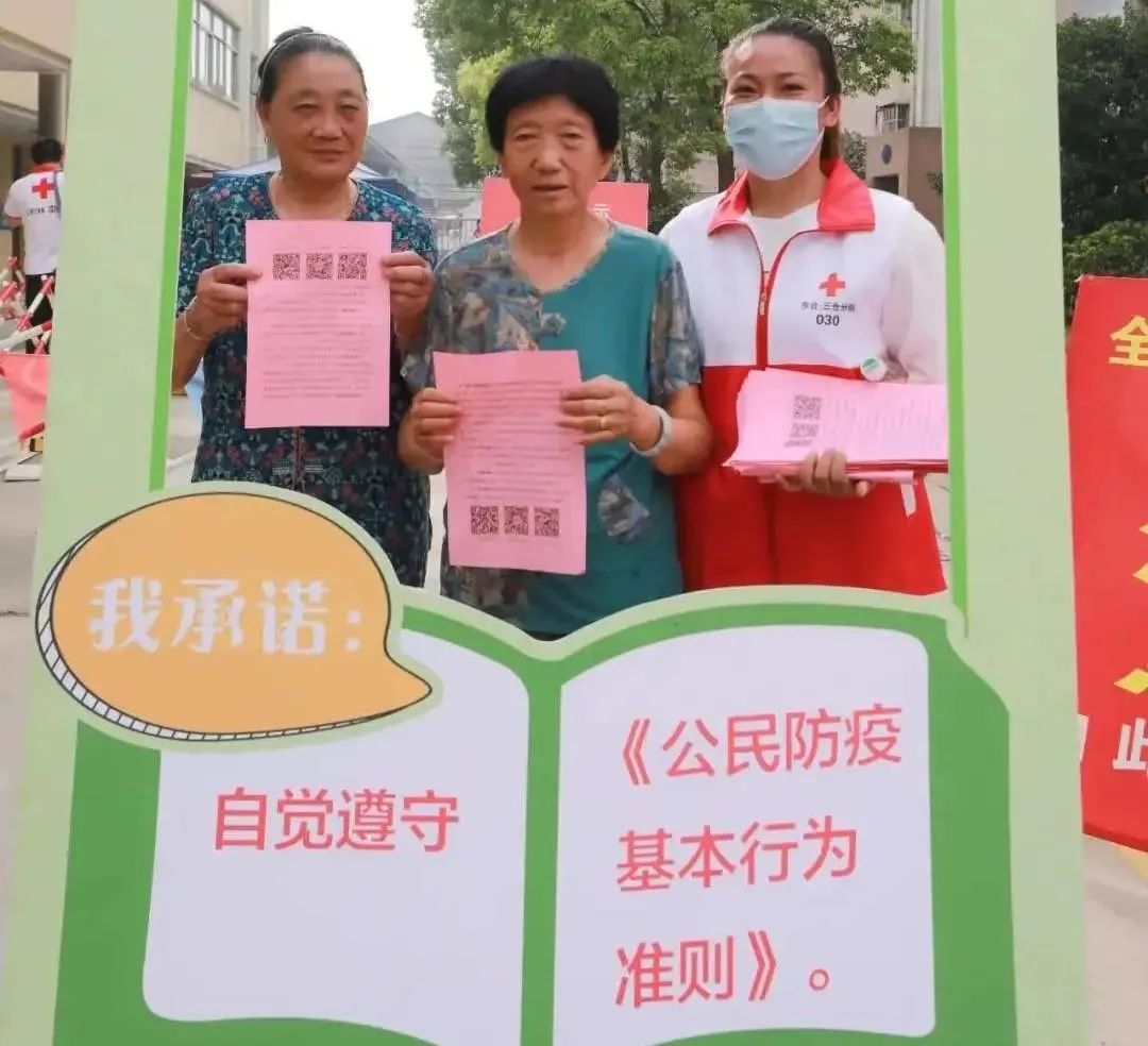 随后,迎着清晨的第一缕阳光,红十字志愿者们走上街头,沿街播放宣传音频。在菜市场、商店、健康小屋等地,向群众发放宣传单,讲解第九版的防疫知识。同时,邀请群众合影承诺自觉遵守《公民防疫基本行为准则》。