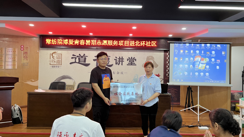 最后,举行常州纺织服装职业技术学院机电学院大学生暑期社会实践基地授牌仪式,北环社区党委书记王海英、机电学院全体辅导员共同为社会实践基地揭牌。王海英在讲话中认为,此次社会实践基地的成立,是北环社区凝练资源优势,加强与高校联系,提升人才竞争力的有力举措,也为社区社会治理工作注入了新鲜血液,提供了有力支持。