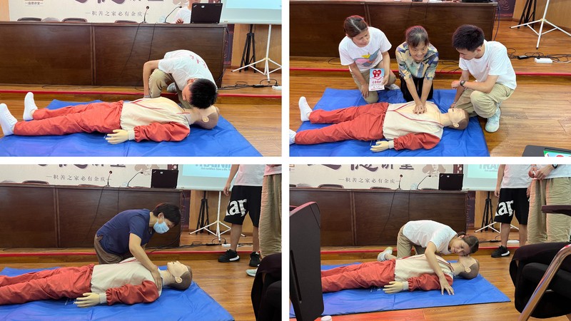 活动中,志愿服务团成员张海波用专业的理论知识和典型的实际案例,详细讲解了心肺复苏、创伤救护、AED的使用和气道异物梗阻处理等方面的急救知识。遵循讲解与演示并重、理论与操作结合的方式,积极邀请社区居民通过模拟人实际操作心肺复苏、人工呼吸等急救方法,让大家更直观地领悟到相关急救技术的操作要点。