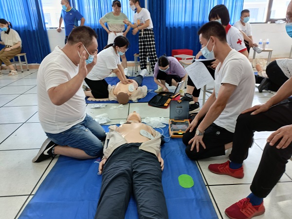 培训共计8个学时,分为三个流程。第一个流程是理论知识的讲授与学习,包括:红十字会运动的基本知识和救护概论、实际救护技巧,对常见急症、意外伤害、突发事件等方面的讲解。第二个流程是现场实践操作,包括:心肺复苏术、创伤包扎、气道异物梗阻等基本技术以及AED(自动体外除颤器)使用方法等。第三个流程是现场考核,在老师耐心、细致的讲解和示范后,进行现场理论考核和实操认定。