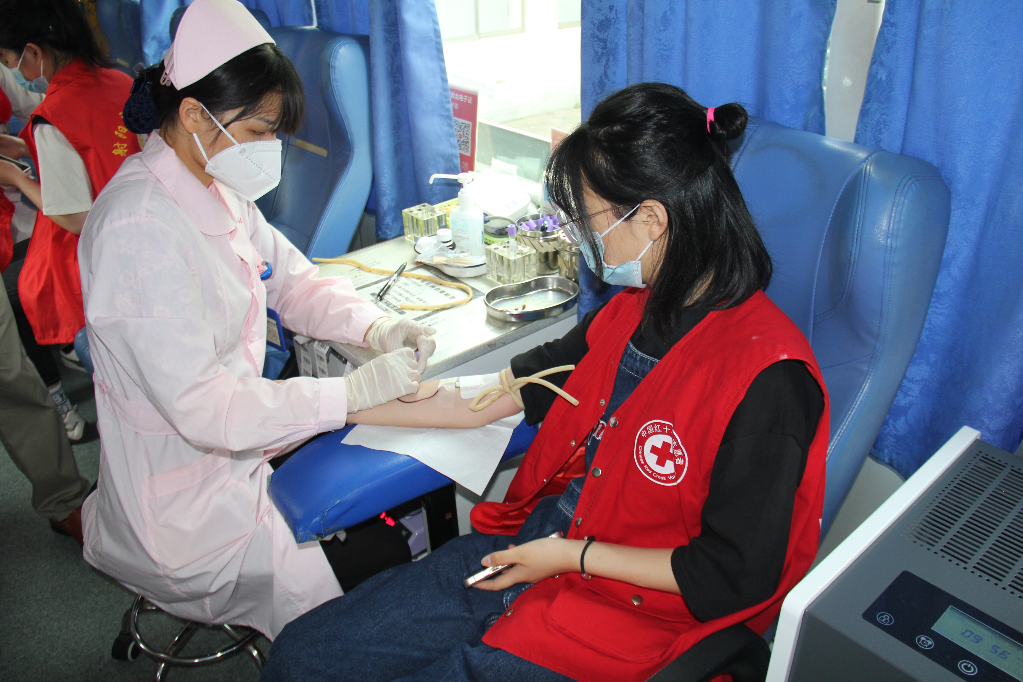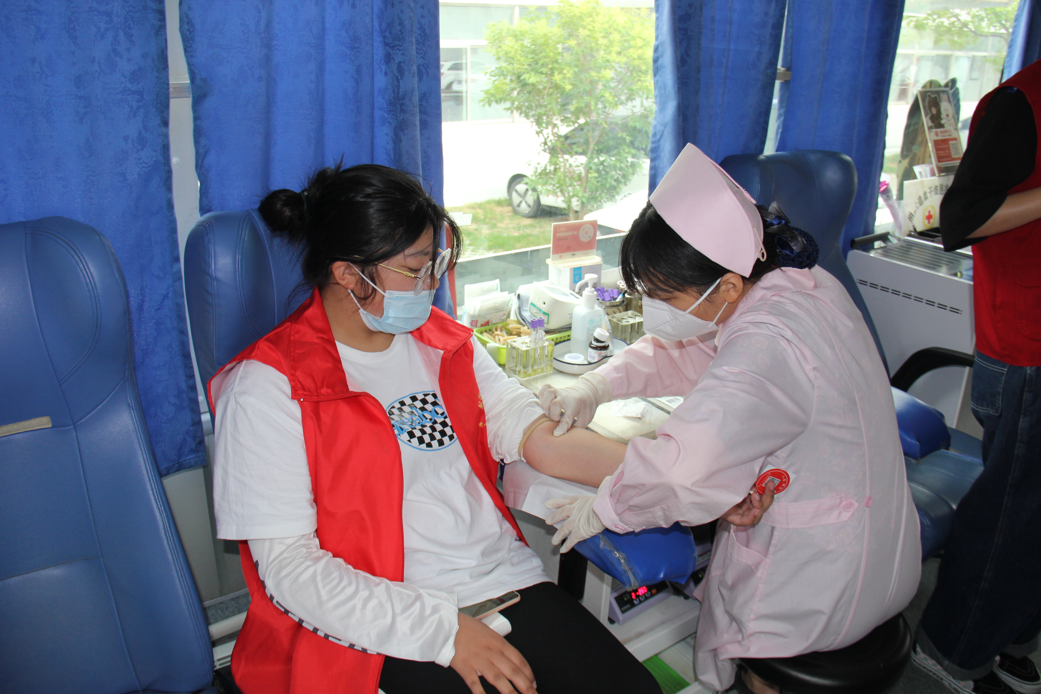 献血车上,同学们井然有序地进行验血、填表、采血、登记等流程,用行动践行着爱心公益。盐城市中心血站的医生向同学们讲述了造血干细胞捐献的相关知识和注意事项,认真检查了每一位献血者的身体状况,并有针对性地提出了相关建议。志愿者们相互协调、互帮互助,为活动的顺利开展提供了重要保障。