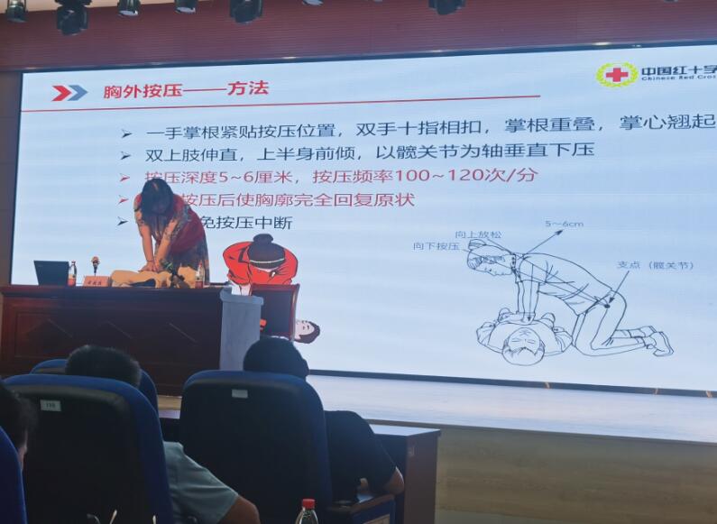 县红十字会黄老师和陶老师分别就成人、儿童、婴幼儿的心肺复苏及AED的使用进行了重点讲解和实场操作演练,赢得了全场的热烈掌声!