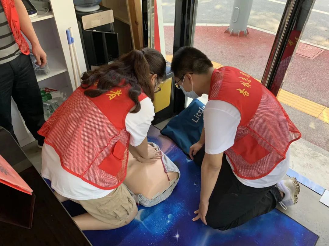 尽管天气炎热,但也阻挡不住志愿者服务的热情,志愿者早早就来到了红十字救护站,现场人气满满。尽管早已汗流浃背,但志愿者们有条不紊地按分工为居民提供服务。活动现场,还利用模拟人为居民演示了心肺复苏过程。救护站的值班得到了志愿者们的大力支持,正值暑假,也有志愿者子女参加活动并现场学习了心肺复苏术等应急救护知识。