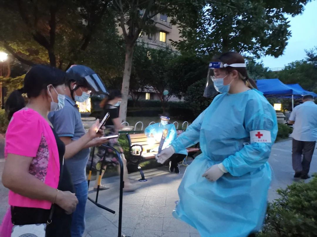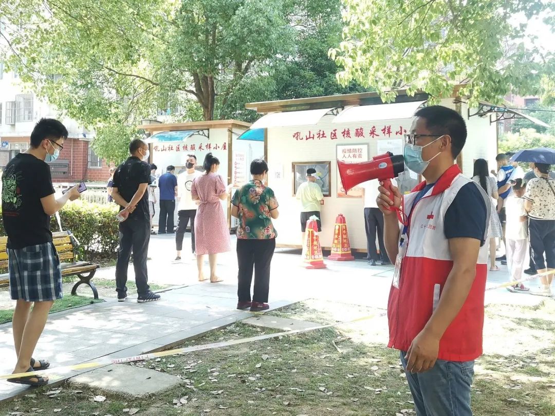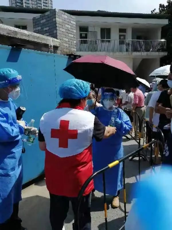 志愿者同社区工作人员想在一起、干在一起、融在一起。协助社区为老年人、行动不便人员和孕妇等特殊群体,开设绿色通道;安排居民在树荫、帐篷下等待,手持门铃码让居民逐一扫码,减少居民在太阳下暴晒。