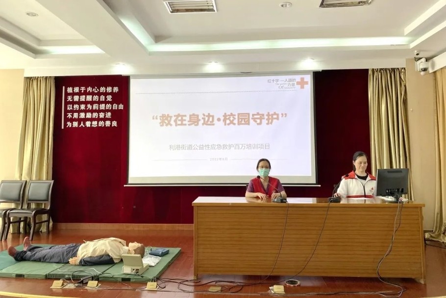 为进一步提高广大师生紧急避险和自救互救的意识与能力,保障师生的生命安全和身体健康,6月24日,利港街道红十字会联合市红会救护培训师季霞,在利港中学开展公益性应急救护培训项目进校园活动。
