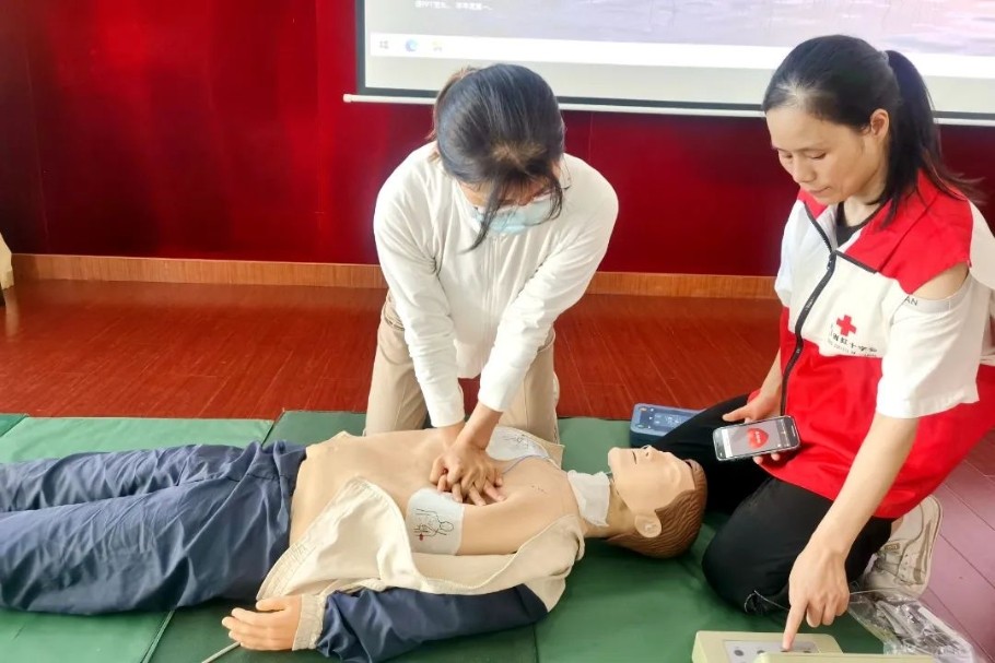 活动中,季霞与助教采用理论授课与实际操作演练相结合的方式,对全体教师进行了心肺复苏(CPR)和体外除颤仪(AED)的救护技能培训,让教师们详细了解了心搏骤停、急救系统与“生存链”等基本概念,以及心肺复苏的救护要点和操作流程。