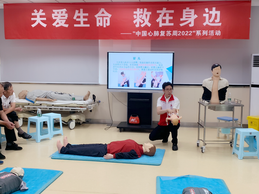 培训现场,救护培训师资徐老师向学员们以生动的实例讲授了救护概念、心肺复苏、创伤救护等知识,演示了心肺复苏术、人工呼吸法、三角巾绷带包扎、AED使用和气管异物梗阻的急救方法等紧急救护技术。