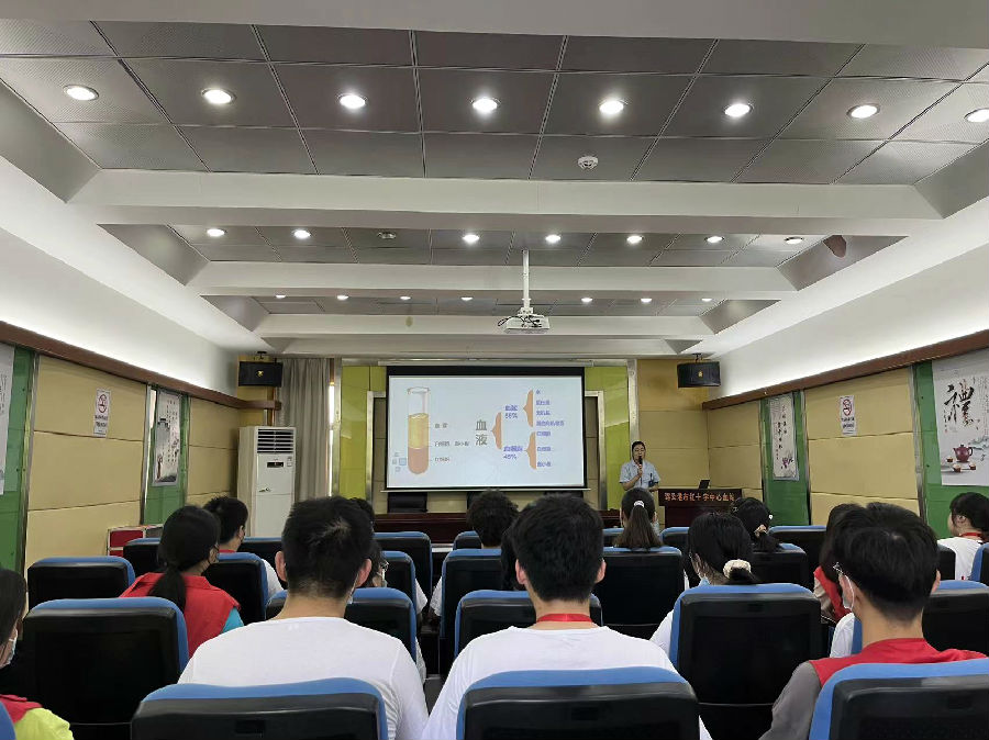 在献血站报告厅,一场有关无偿献血的讲座正在进行。主讲人从血液基本常识、献血与健康、献血基本要求、献血奖励政策、血液去哪儿了等五个方面来讲解。通过讲座,大家对血液的组成及不同成分的功能有了一定程度的了解;明白了A型血、B型血、AB型血与O型血的区别;学到了献全血与献成分血的不同;知道了献血到一定程度会获得省级奖项或国家级奖项及免费参观景区等福利。参加完讲座的同学分享道:“这次讲座非常棒!我学到了一些有意思的小知识,如献血前可以通过提踵来放松自己,也是才知道献血还可以延年益寿。”