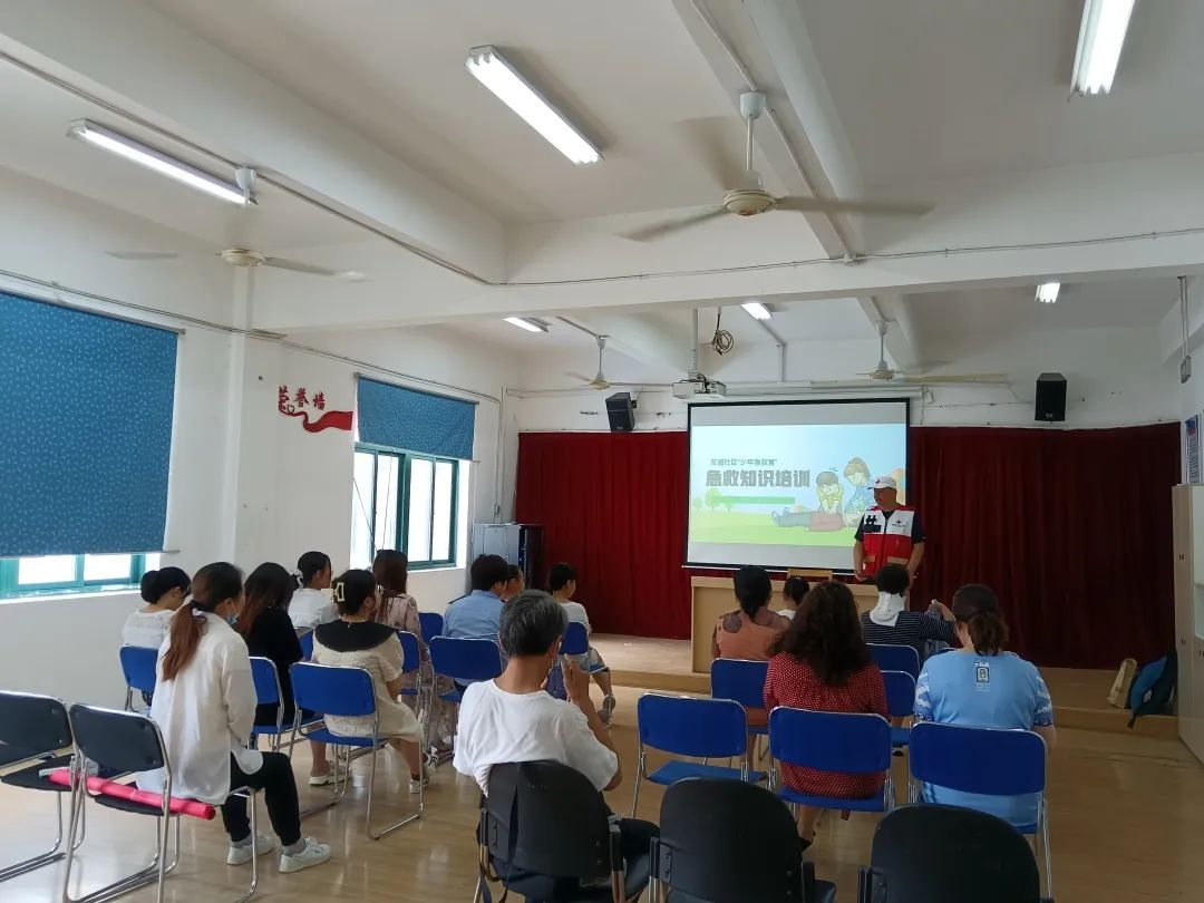 2022年7月20日,南通市崇川区红十字赈济救援队队员朱飞受邀到城东街道友谊社区,为社区中小学生、工作人员,民警以及志愿者讲解心肺复苏、高温防暑、烫伤急救、火灾灭火、火场安全撤离、海姆立克施救等急救知识,40多人参加了活动。