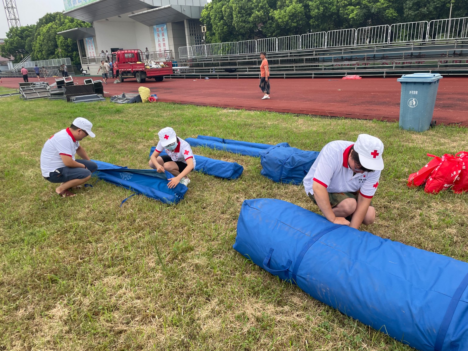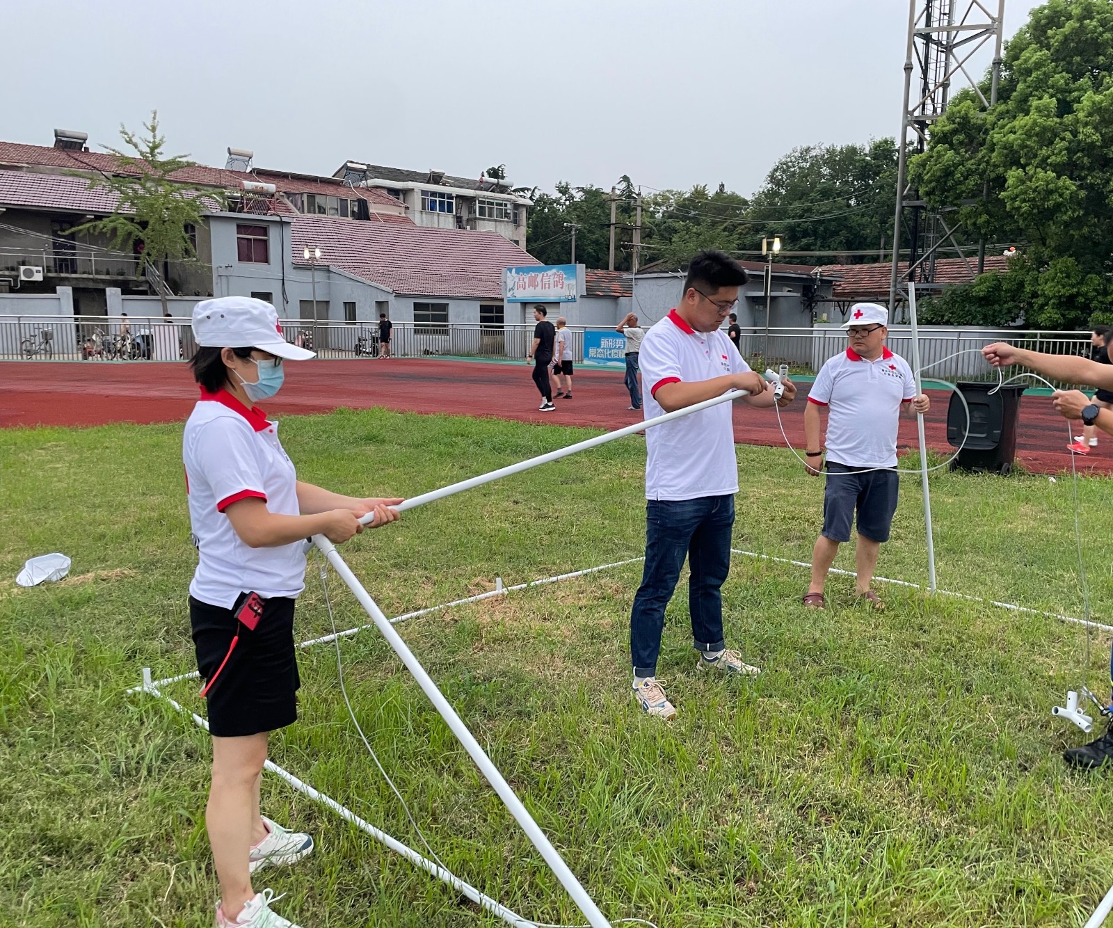 正式活动前,在分会场,红十字应急救援队联合高邮市应急管理局搭建应急帐篷,以供避难、医疗使用。队员们一到现场,立即进行任务分工,明确目标。虽然天气炎热,但是在大家齐心协力下,拉伸、撑顶等一气呵成,一小时不到,2顶“高邮市红十字会”标识的帐篷便搭建完成。