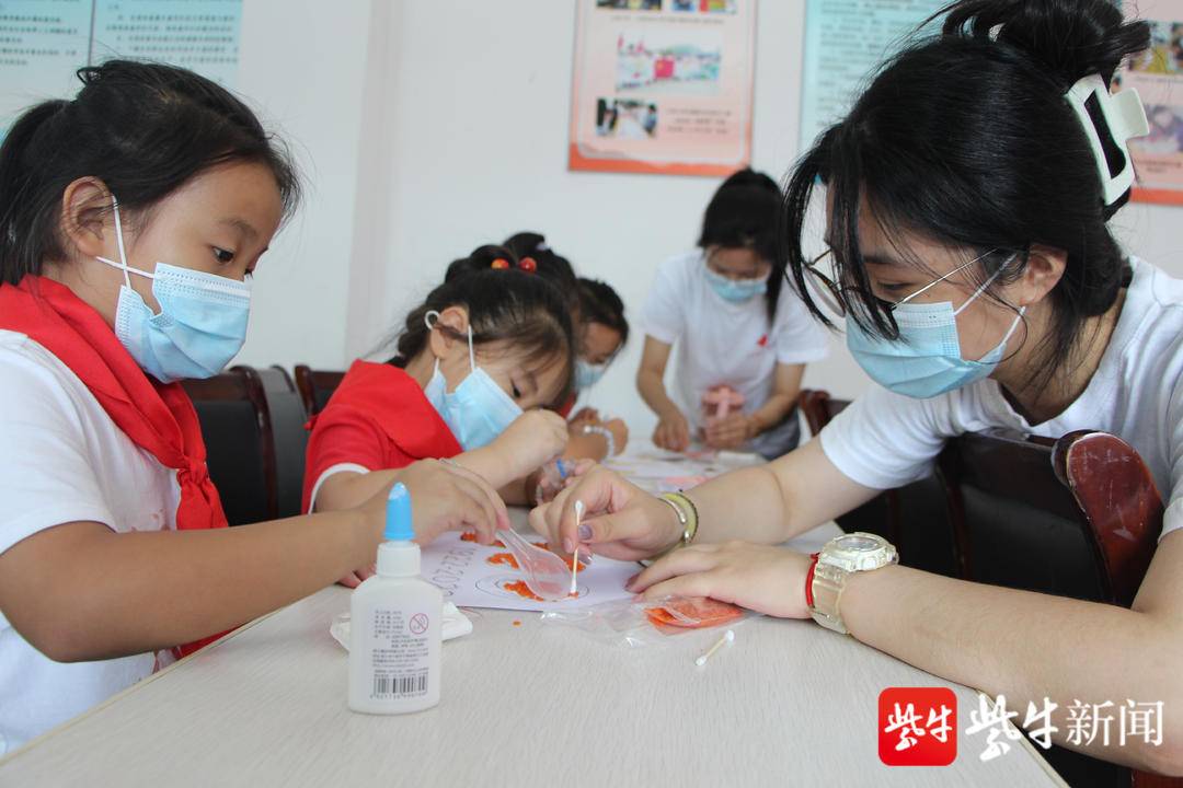 盛夏时分,一间小教室,几排课桌椅。7月27日,在茅山老区镇江丹徒区上党镇其一村校外辅导站内,8名江苏大学京江学院⻘年志愿者协会的成员,正在和孩子们一起做DIY手工。两两一对,三五一群,志愿者和孩子们就像兄弟姐妹一 样,亲密合作。不一会儿,就拼出了一面面共⻘团旗帜。