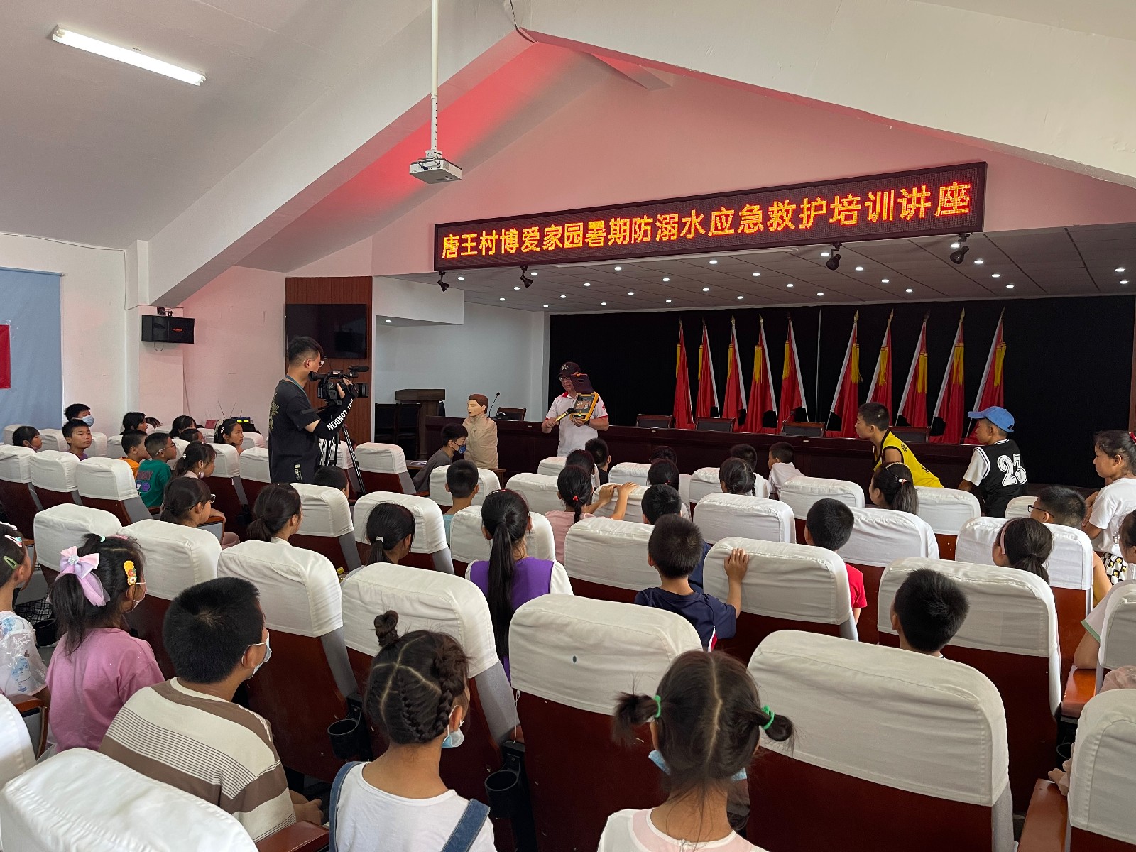 课堂上,红十字应急救护培训师资张建中针对唐王村水系发达、留守儿童多这一特点,深入浅出地向孩子们讲述了溺水的严重危害性,结合典型案例教育广大学生要远离危险,预防溺水。针对遇到溺水紧急情况如何拨打求救电话、如何自救及安全互救等方面进行了详细讲解和演练,并通过模拟演示,现场为同学们操作演练了溺水后急救措施(CPR+AED)等内容,使同学们在较短的时间内了解防溺水知识和应急救护的重要性,进一步增强孩子们识别险情的能力,提高预先避险的能力,保障他们的生命安全。