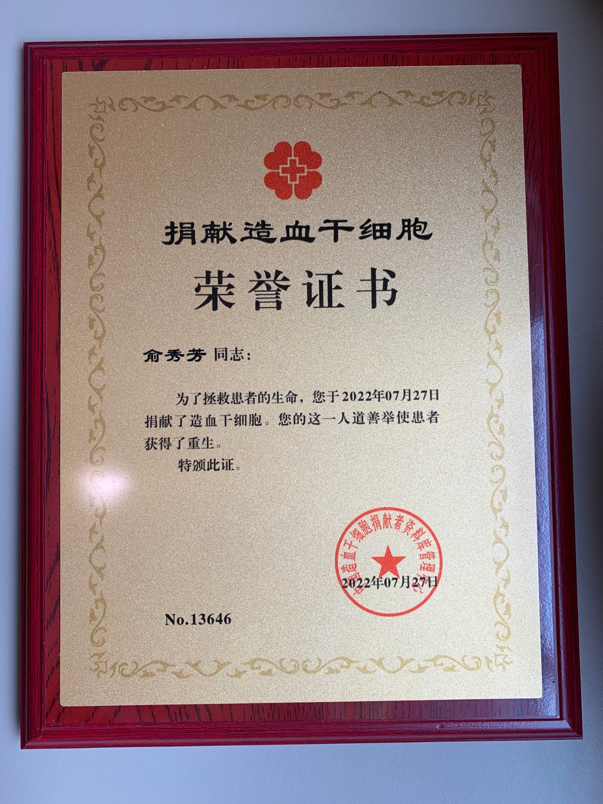 据了解,俞秀芳从事个体中介工作,平时积极参加社会公益活动,自2014年开始,俞秀芳同志就开始参加无偿献血活动,献血量已达2000毫升。2015年6月14日,她在参加献血时听说加入中国造血干细胞捐献者资料库,可以为血液病患者增加一份希望,俞秀芳当即要求登记相关信息,参加造血干细胞血样采集,成为了中华骨髓库的一名造血干细胞捐献志愿者。