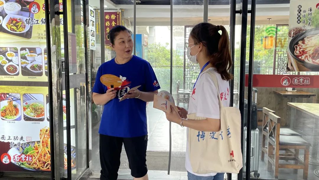 在西津渡古街,志愿者给周边的店家和游客详细介绍了应急救护的基本原则,重点讲解了现场心肺复苏操作要点、自动体外除颤器使用方法和防暑降温知识。