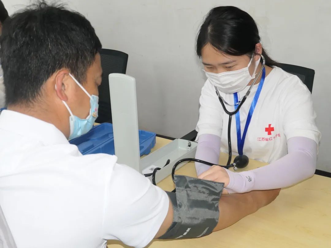 在江苏科技大学西校区,志愿者提前做好了活动准备,摆放好桌椅以及血压计,为学校后勤、保洁人员义务测量血压并准确告知其测量结果,耐心回答了大家的问题并告知一些饮食运动时的注意事项。