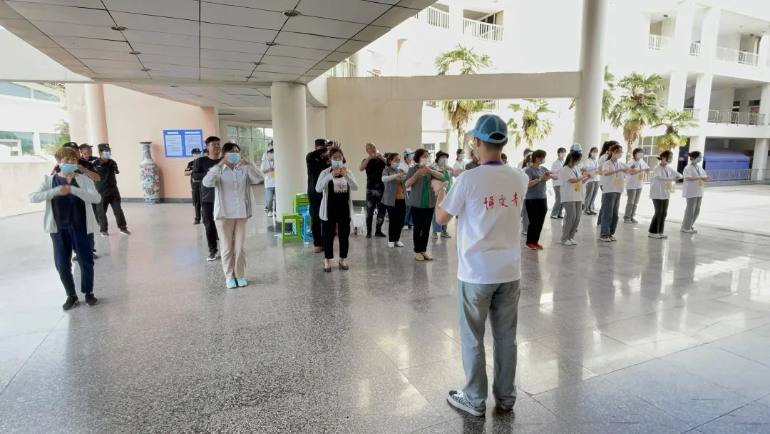 志愿者进行海姆立克法的讲解及演示,让后勤人员相互练习救助他人自救的方法,以及在遇到学生食物阻塞,能够在最短的时间内解救学生的方法,最后志愿者带领校区后勤人员跳经络操。