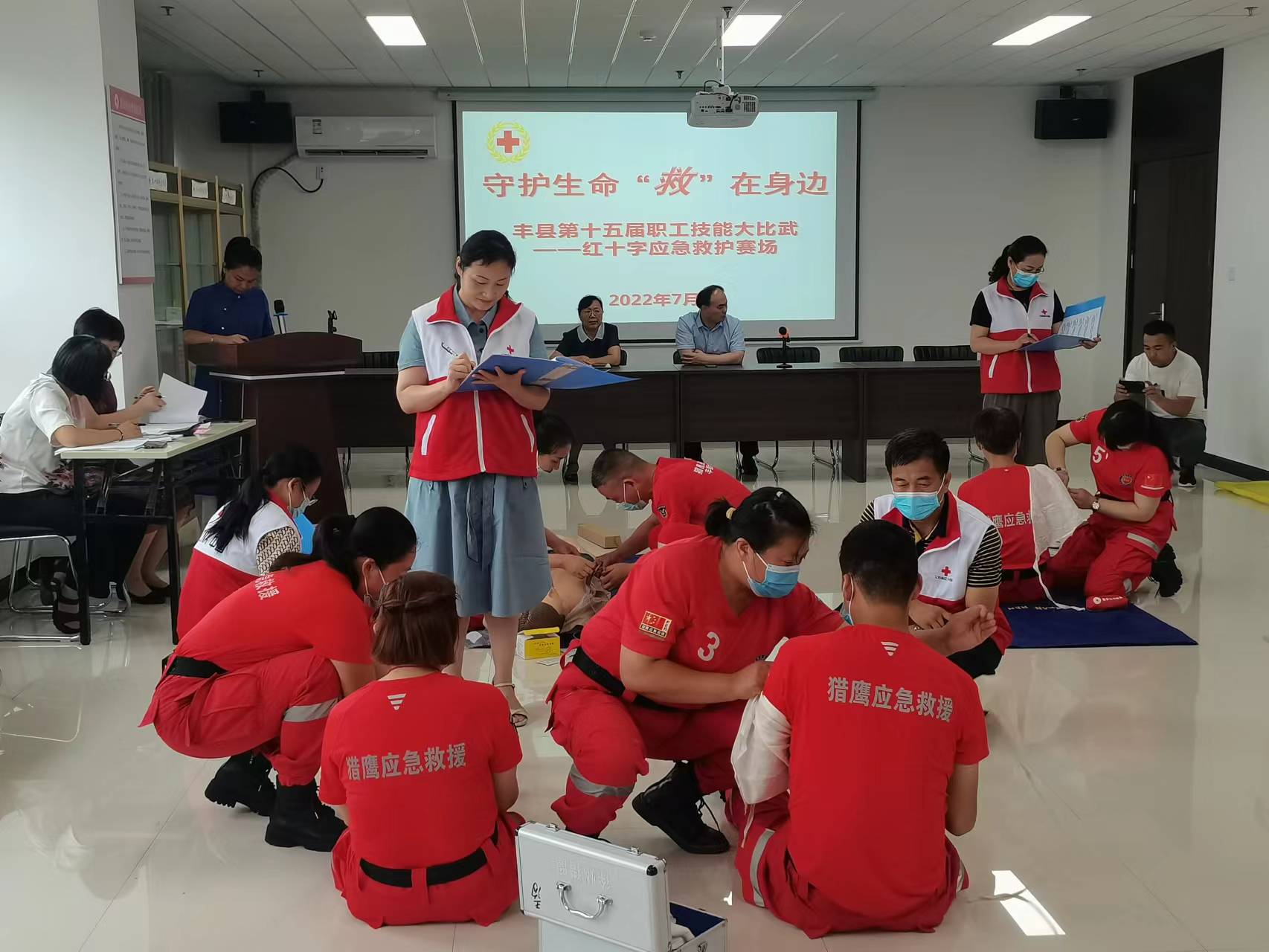 2022年7月29日,由县委人才办、县总工会、县人力资源和保障局、县红十字会共同开展的2022年丰县第十五届职工技能大比武—红十字应急救护技能大赛圆满结束。本次比赛以“守护生命 救在身边 ” 为主题,来自丰县辖区内的多支应急救援队伍参赛。