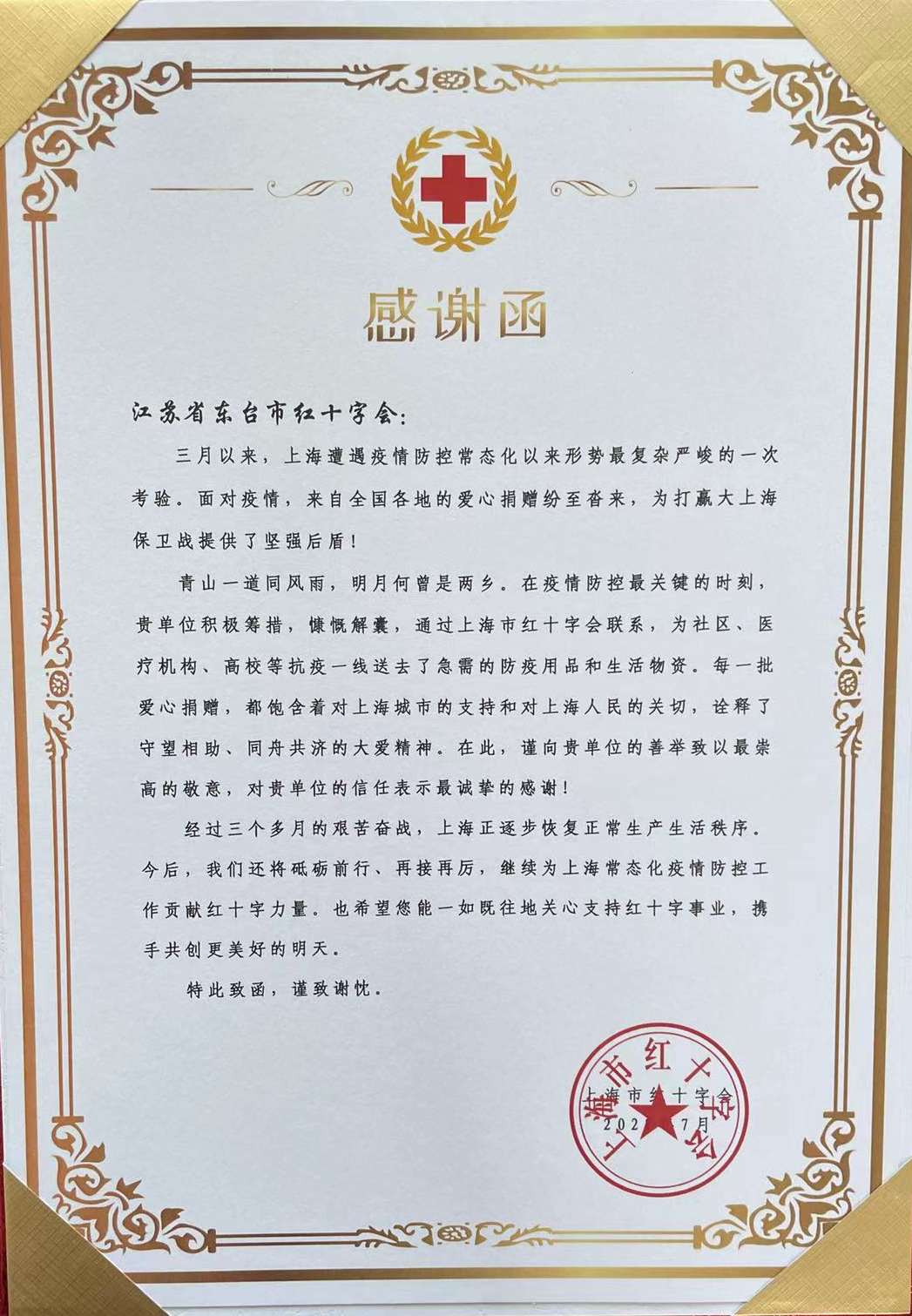 [盐城市]纸短情长东台红会收到上海发来的感谢信