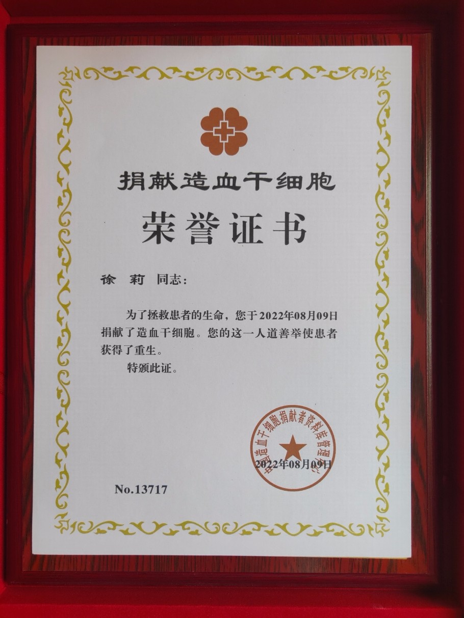 在捐献的这一天,徐莉收到患者手写的一封感谢信,信中这样写道:“感恩感谢您为我捐献的骨髓,是让我生命里充满爱、充满阳光、充满自己自信的良药,我始终觉得这个社会上绝大多数的人是好心的人……我会学习你大爱的精神,在未来的日子里做一个乐于助人的人,帮助有困难的人发扬你的伟大的精神,把你给予的爱心传递下去。”徐莉非常高兴自己的造血干细胞能为素不相识的患者送去重生的曙光,她希望这位患者早日康复,也真心希望更多人能加入中国造血干细胞捐献者资料库。