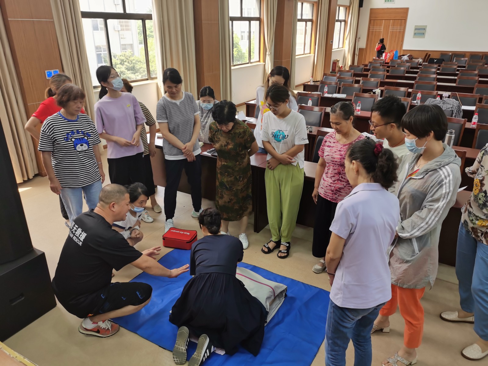 8月12日,在戚墅堰街道开展的初级救护员培训活动中,常州市厚天救援队的王老师一边利用人体模型演示心肺复苏步骤,一边向参训学员介绍CPR(心肺复苏术)、AED(自动体外除颤器)和急救包扎等实操项目和急救设备的使用方法。