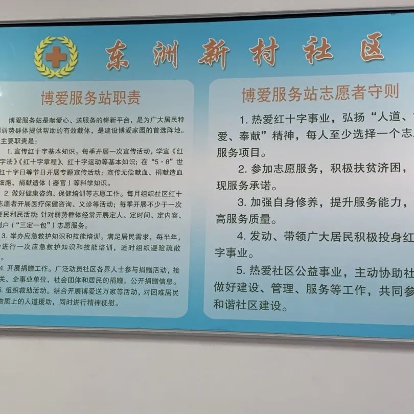 东洲社区积极倡导红十字理念、弘扬红十字精神,在居民中播种红十字文化的种子。社区博爱家园配有博爱超市、募捐箱、康复器材、宣传栏、固定活动场地等服务设施。同时,社区充分利用现有宣传栏、电子显示屏、社区微信群等宣传阵地,加强红十字人道主义宣传力度,宣传红十字运动的理念、宗旨、原则、精神、标志,同时在重要节日开展文化传播、无偿献血、爱心义卖、免费义诊、法律咨询、送温暖等红十字元素活动,切实把“人道、博爱、奉献”的红十字会精神融入社区居民生活。