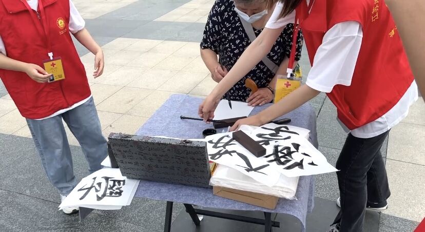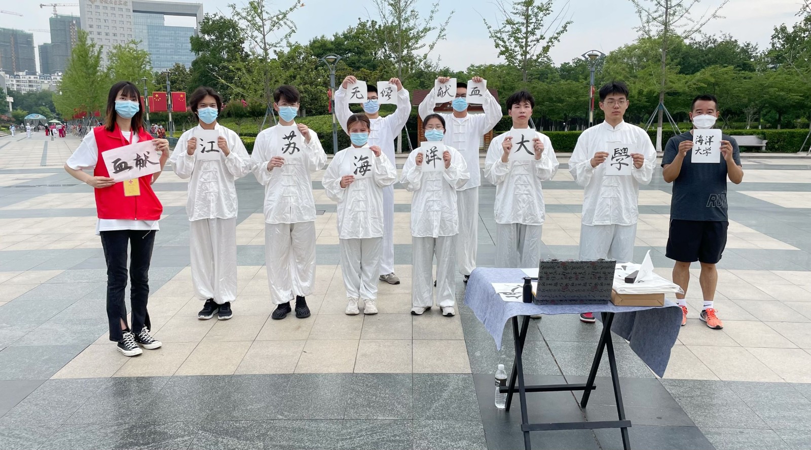 太极活动顺利开展的同时,我们在街边邀请路人一起体验写毛笔字的乐趣来陶冶情操。志愿者们还与路人一起探讨书法,随着毛笔的舞动,志愿者用黑色的墨汁在雪白的宣纸上勾画出一个个苍劲有力的大字:“江苏海洋大学——无偿献血活动”。整幅作品显得气势宏大,毛笔字更是遒劲圆润。这时,有一位老者来到在桌前驻足观望,志愿者热心邀请他上前一试,随后只见他凝神定气,笔法娴熟,手中握笔潇洒自如,在宣纸上写下“海洋大学”这四个墨字,如行云流水,一气呵成!书法里融入了儒家的坚毅,果敢和进取,体现了中华文化的博大精深!在路人的积极配合下,我们共同完成了书法宣传。周边的志愿者们向来往的路人们发放并讲解无偿献血宣传手册,不少市民被宣传活动深深吸引,驻足观赏。