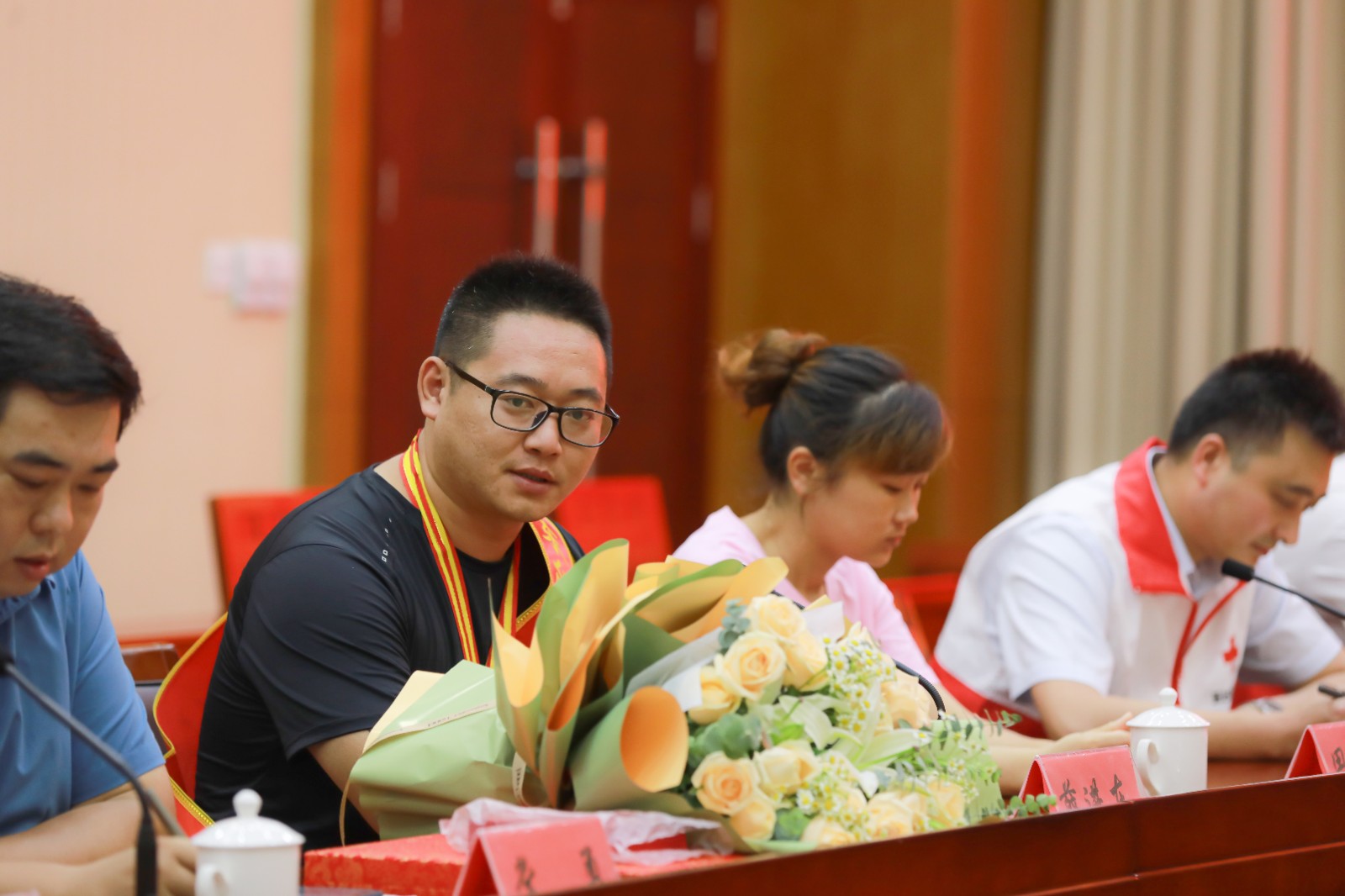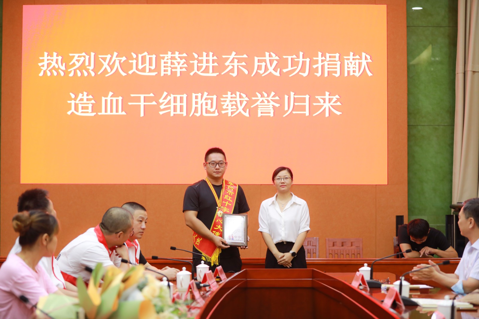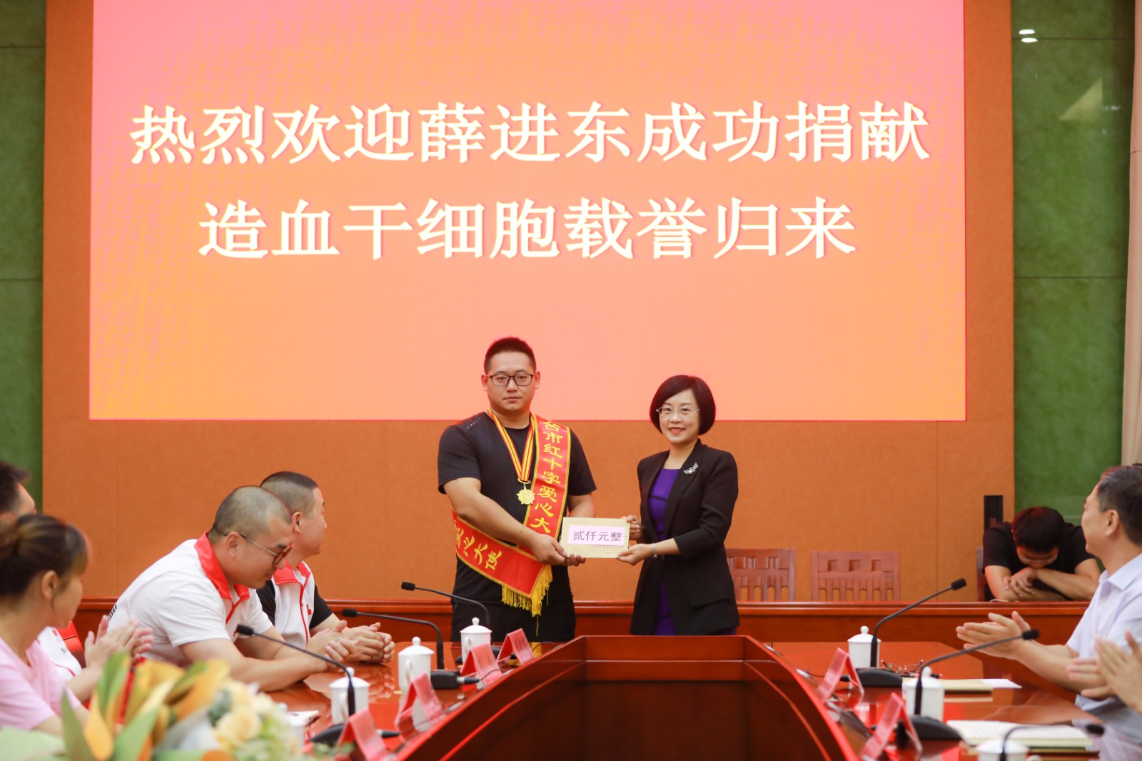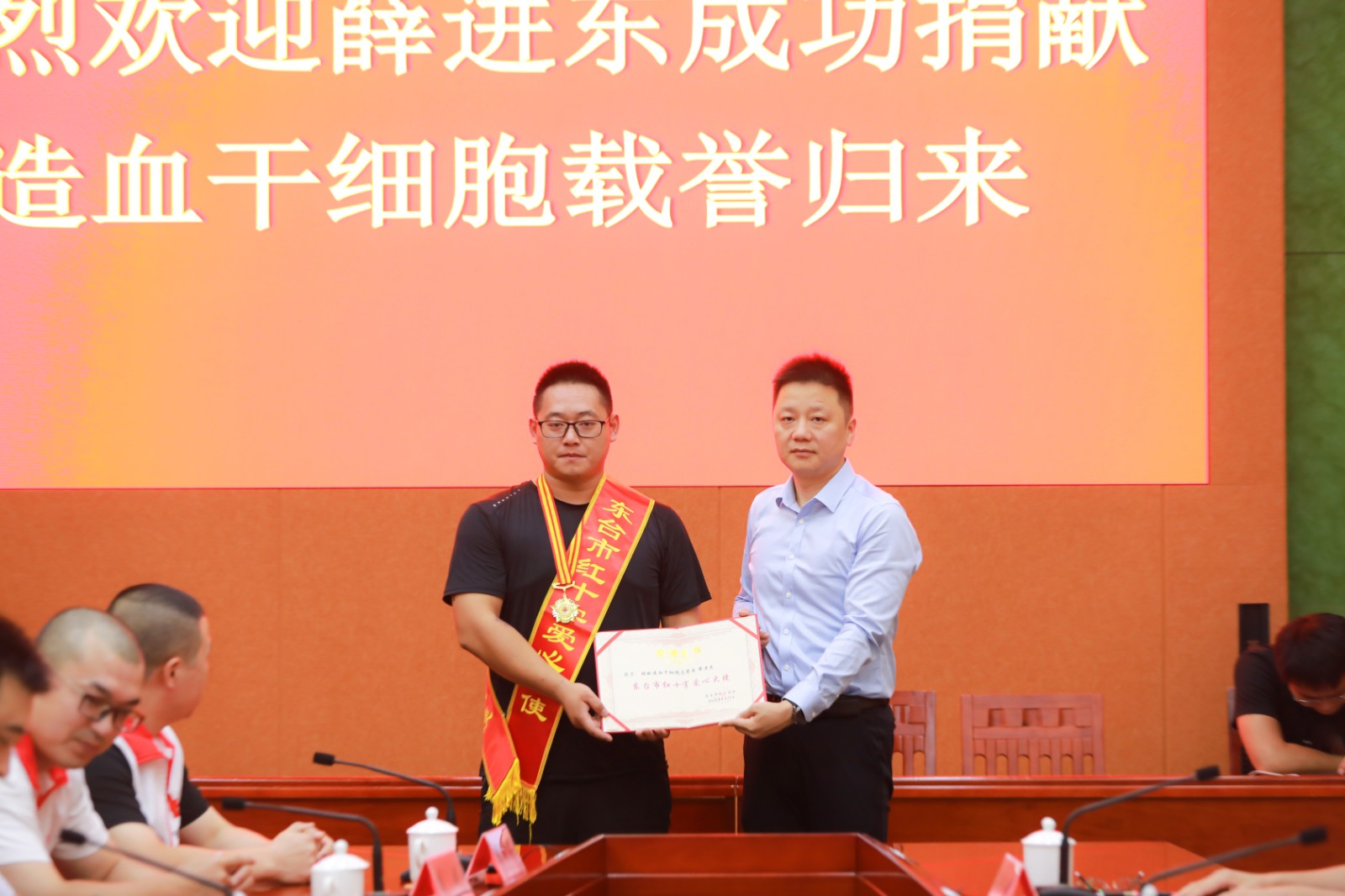 8月18日上午,薛进东成功捐献造血干细胞载誉归来欢迎仪式在市政府第二会议室隆重举行,副市长、市红十字会会长王颜勤,政府办分管主任、红十字会副会长丁毅,市委宣传部副部长、文明办主任吴晓明,团委书记徐文娟及成功捐造血干细胞志愿者等参加了活动。会议由红十字会常务副会长杨爱兵主持。欢迎仪式上,红十字会、团市委授予薛进东“东台市红十字爱心大使” ,“东台市优秀青年志愿者”等荣誉证书。对他成功捐献造血干细胞的义举表示祝贺和感谢。王颜勤表示,这样的行为体现了大爱无私的精神,希望全市上下持续做优服务,进一步挖掘好、宣传好、引导好,吸引更多人加入到造血干细胞捐献志愿者队伍,为建设美丽幸福东台作出新贡献。