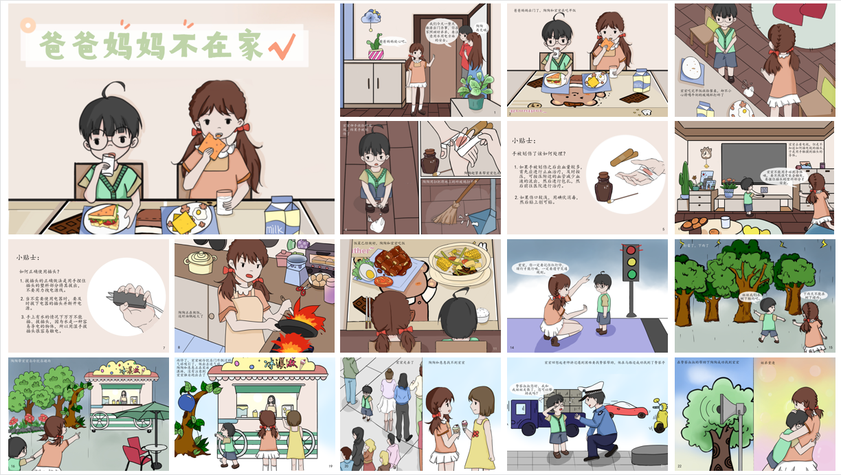 除提供暑托课程外,志愿服务团队围绕急救主题开发原创科普绘本,经过查阅相关资料、认真研讨、精心绘制和反复修改完善,最终制作出5本构图巧妙、符合儿童审美、安全教育内容丰富的绘本,将生活中必备的安全知识以孩子们喜闻乐见的方式呈现出来。贴近生活的故事情节和通俗易懂的语言引起了儿童的情感共鸣,在孩子们中引起热烈反响。为进一步扩大受众范围,志愿服务团队结合新媒体,分别围绕心肺复苏术、海姆立克急救法、防疫健康知识等健康安全主题,撰写视频脚本,拍摄科普视频,撰写微信推文,以生动的情景模拟为导入,细致地讲解了面对突发事故的应对方法和操作要点。