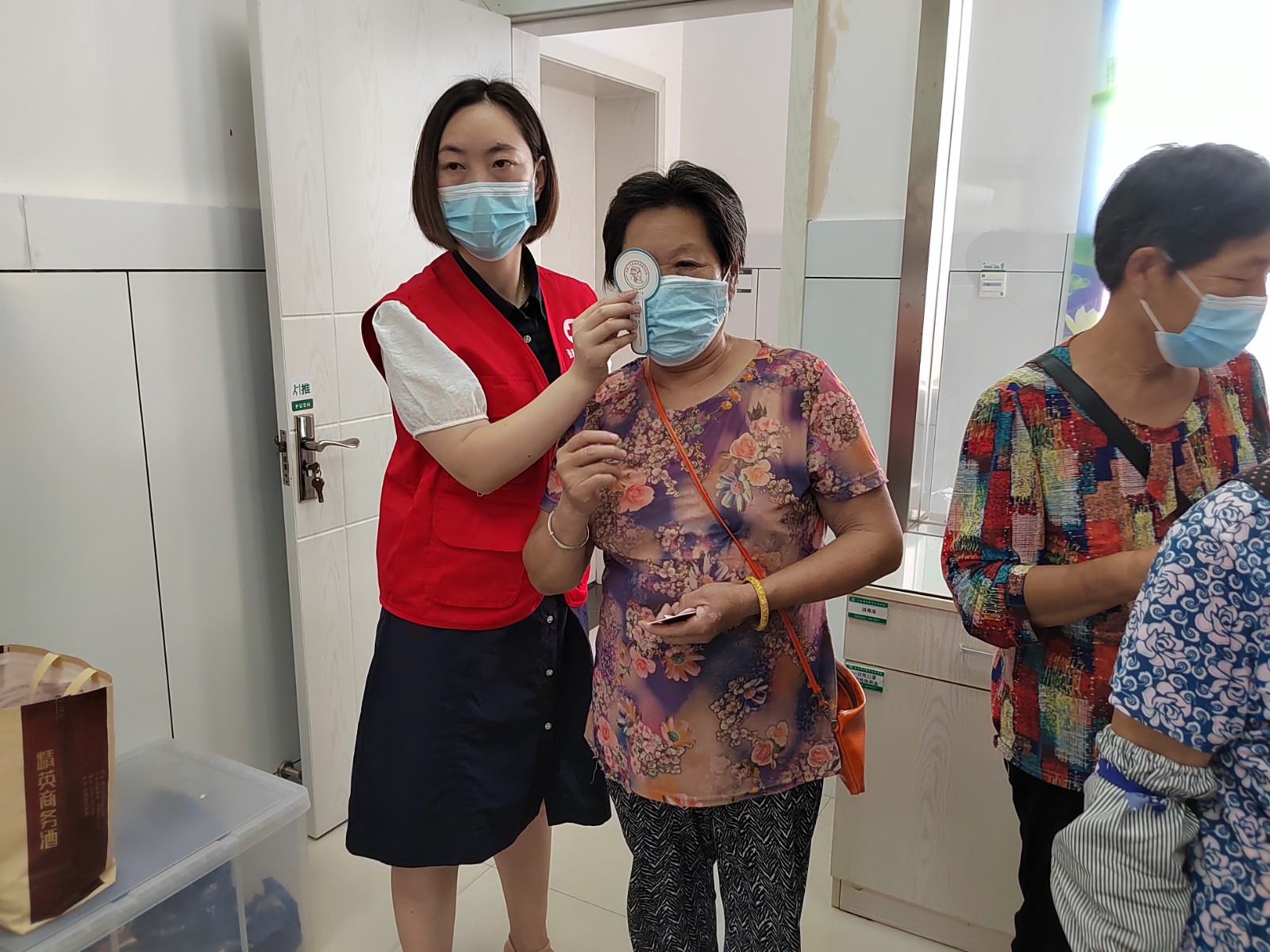 义诊现场,医务人员免费为辖区老年人、低视力等人群进行了眼科疾病的常规检查,并为在场居民做视力测量,对于居民们提出的相关问题,医护人员耐心讲解,为居民普及眼部护理知识。同时,在现场的红十字志愿者也帮助医务人员为居民提供服务,引导大家有序排队,有序检测。此次义诊共筛查约两百名眼病患者,白内障患者约二十多名,医生建议至医院做下一步检查以决定下一步治疗方案。