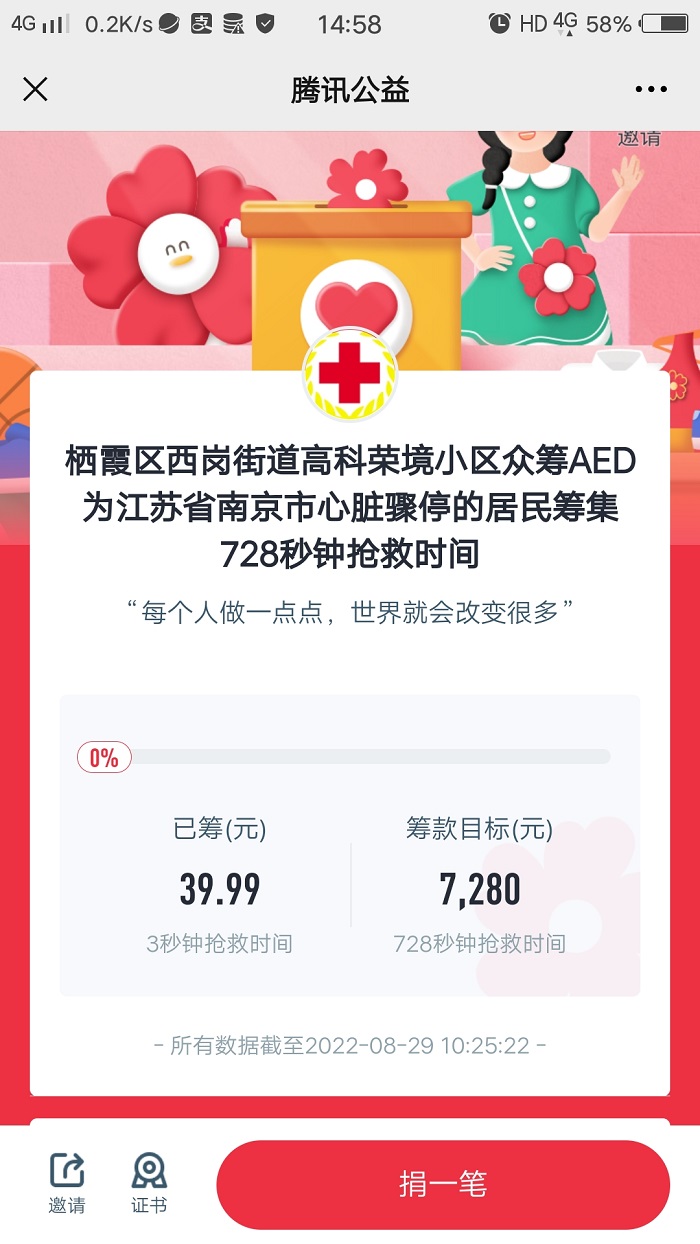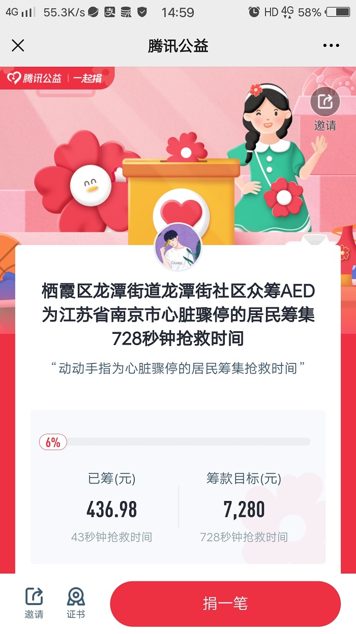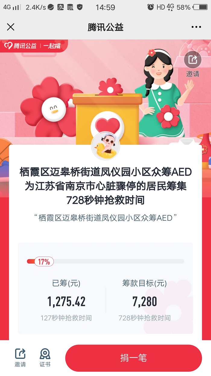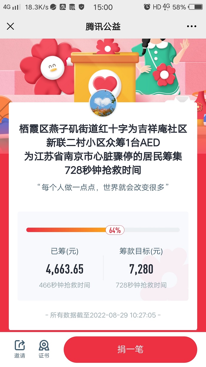 截至目前,已有龙潭街道龙潭街社区、迈皋桥街道凤仪园小区、燕子矶街道吉祥庵社区新联二村小区和西岗街道高科荣境小区4支筹资战队参与“居民小区共筹AED”项目,截止发稿时为止,参与人数330人,募集捐款6416.04元。