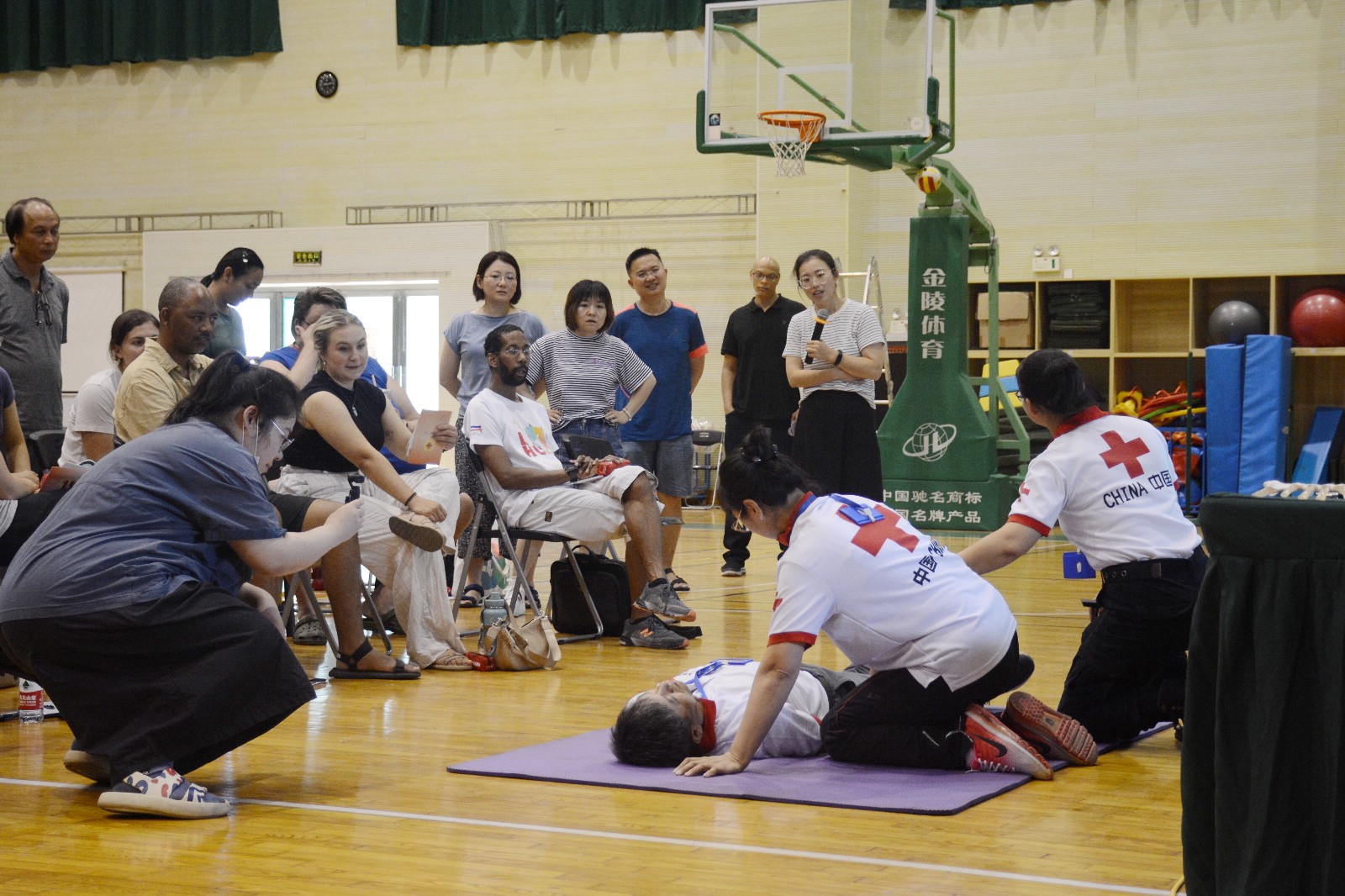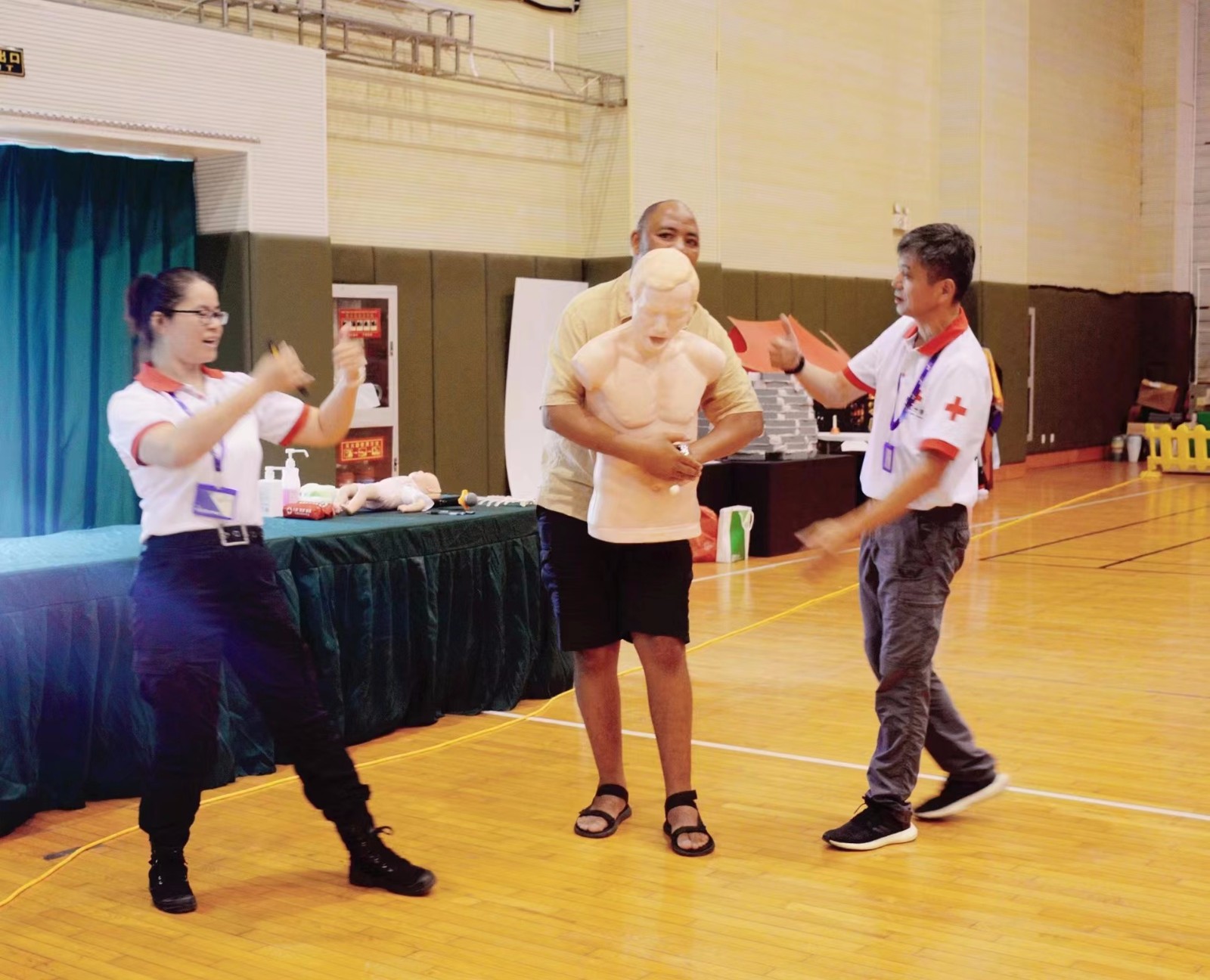 培训课上,唐老师给学员们详细讲解了现场救护的特点、目的意义以及现场救护的程序;借助PPT和现场操作演示,重点介绍了止血包扎、骨折固定、心肺复苏、溺水、中暑以及海姆立克手法等几种紧急情况的急救方法,阐述了止血包扎、骨折固定、心肺复苏的操作步骤,人工呼吸与胸外心脏按压的基本要点,溺水的救援方式、注意事项,中暑的症状和处置方法等理论知识,通过积极的互动、逼真的模拟演示、手把手地操作指导,老师们基本掌握了止血包扎、骨折固定、心肺复苏的流程和技术要领,懂得了中暑、溺水、触电、火灾、烧伤等突发事件的现场急救知识。由于部分参训学员为外籍人员,现场配备了翻译老师,以便外籍老师能够更好地理解和参与到本次培训中。