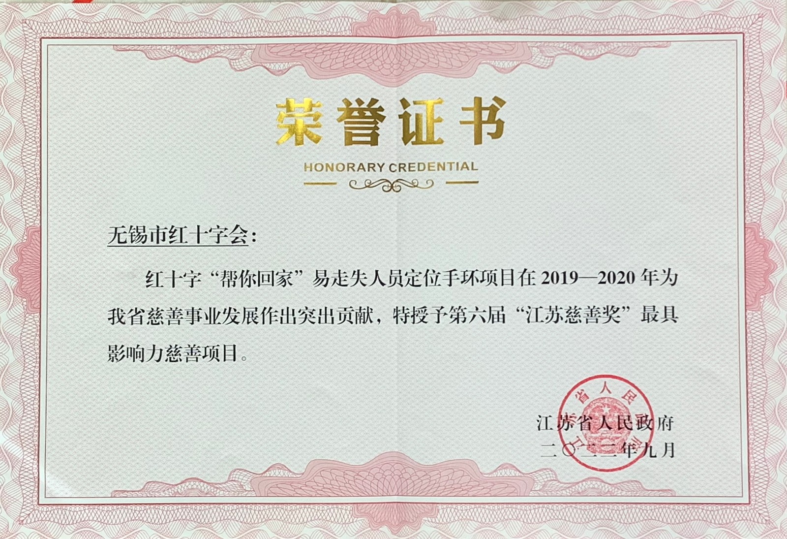 9月5日,省政府召开第六届“江苏慈善奖”表彰大会,无锡市红十字会发起实施的红十字“帮你回家”易走失人员定位手环项目荣获最具影响力慈善项目奖。
