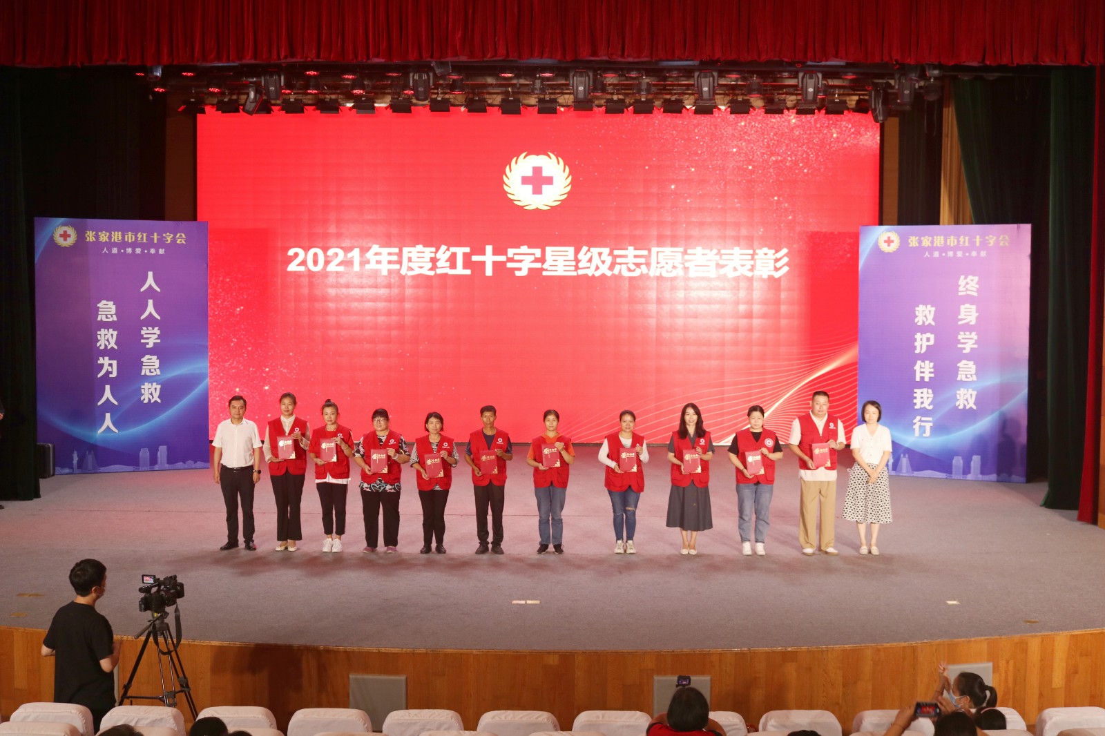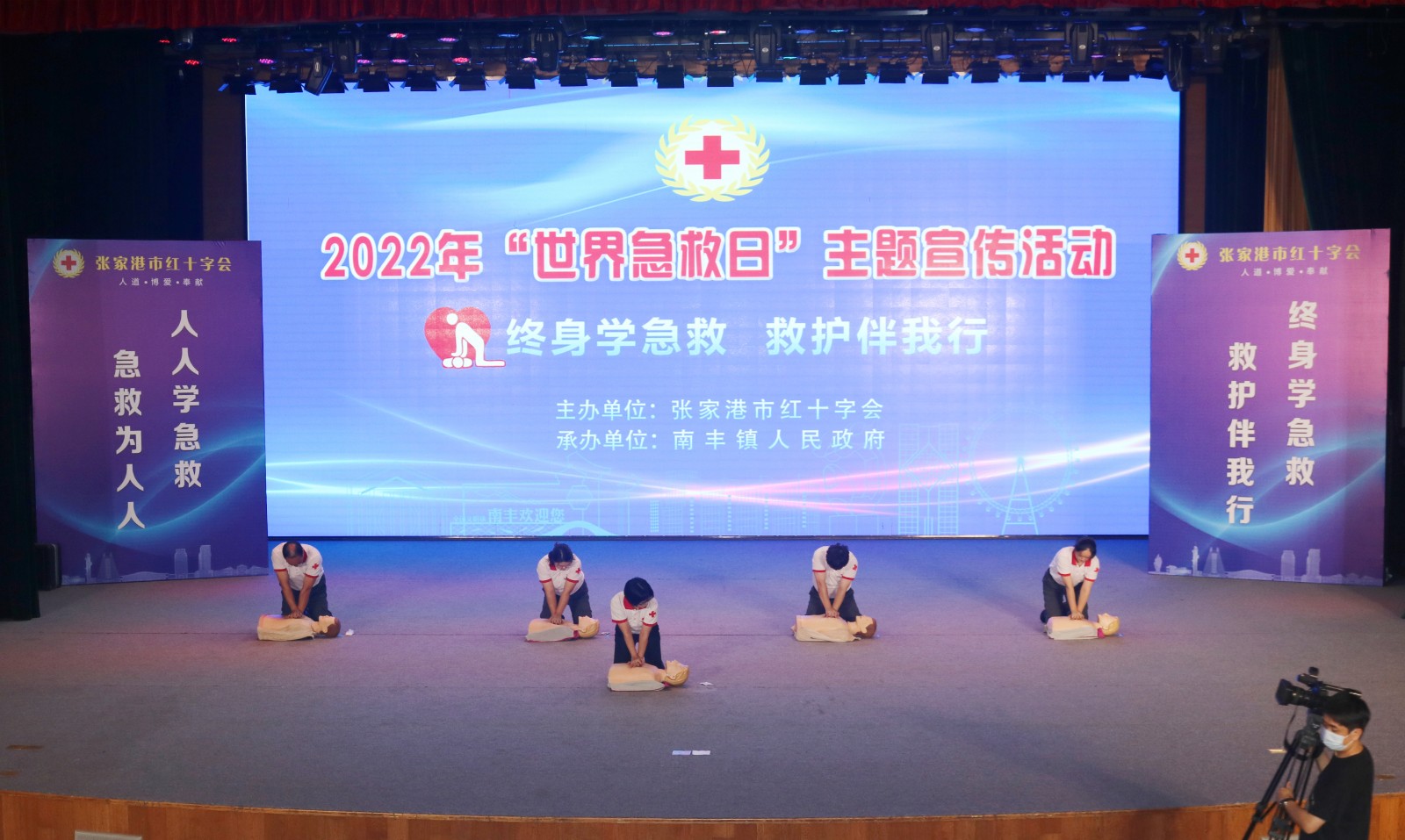 为迎接这个国际性纪念日的到来,同时进一步传播急救知识和技能,提升群众防灾避险意识和自救互救能力,9月8日晚,张家港市红十字会在南丰镇科文中心举办2022年“世界急救日”主题宣传活动。市人民政府副市长、市红十字会会长何剑,市卫生健康委员会党委书记、主任於海良,市南丰镇党委副书记、镇长王希,市红十字会常务副会长丁浩等有关领导出席活动。