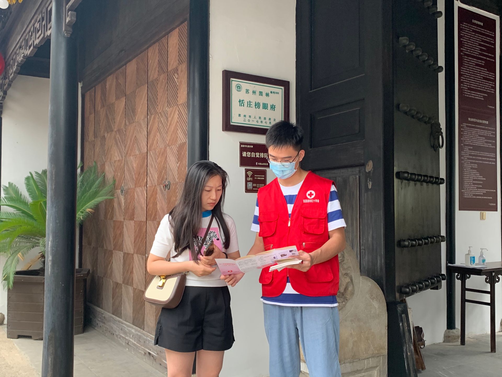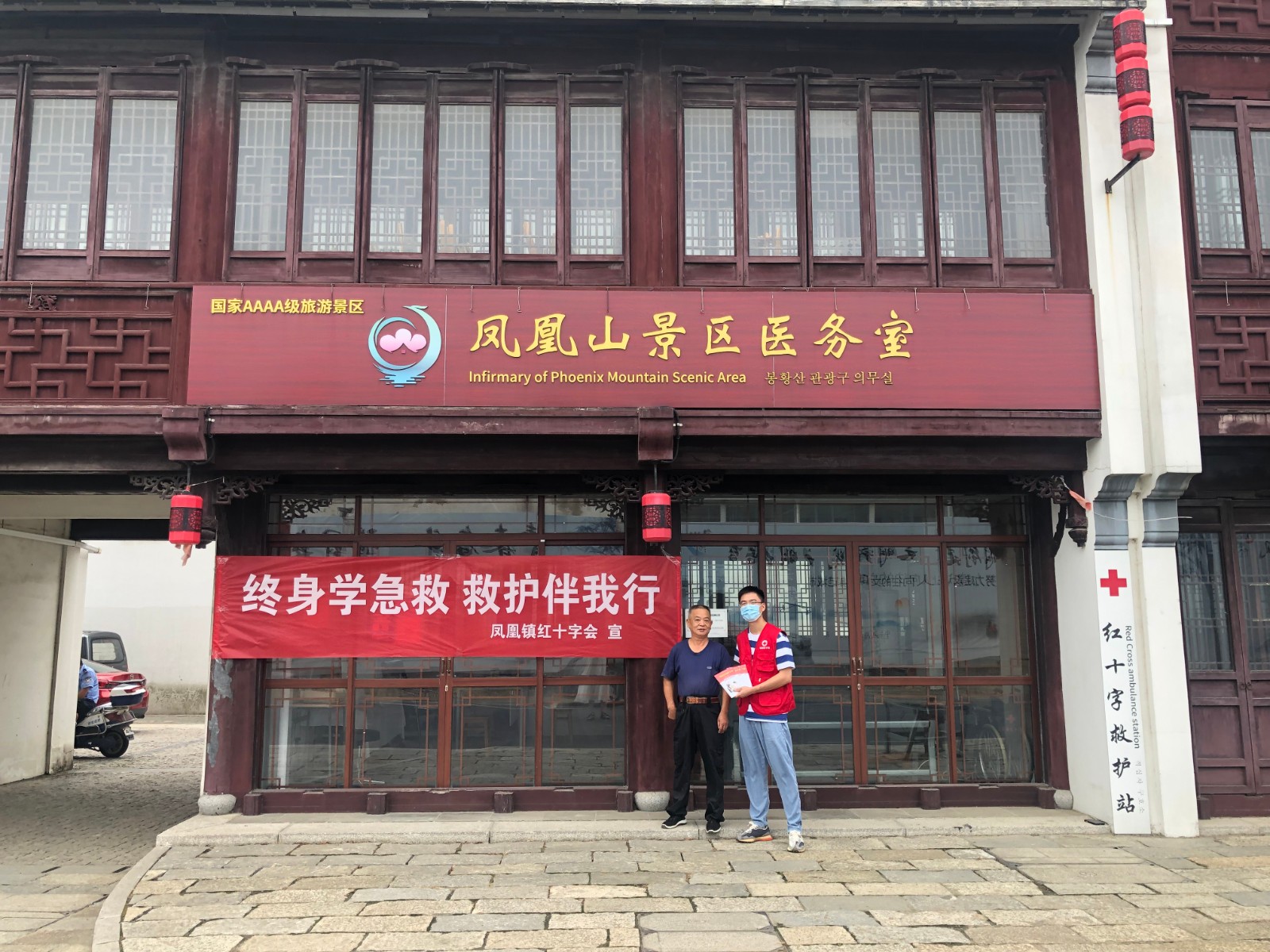 凤凰镇红十字会员和志愿者来到凤凰山景区红十字救护站,向景区警卫室、旅客中心的辅警及工作人员培训了急救方法和技巧,并向来到恬庄古街的游客进行了进行应急救护、无偿献血、新冠防控知识宣传。