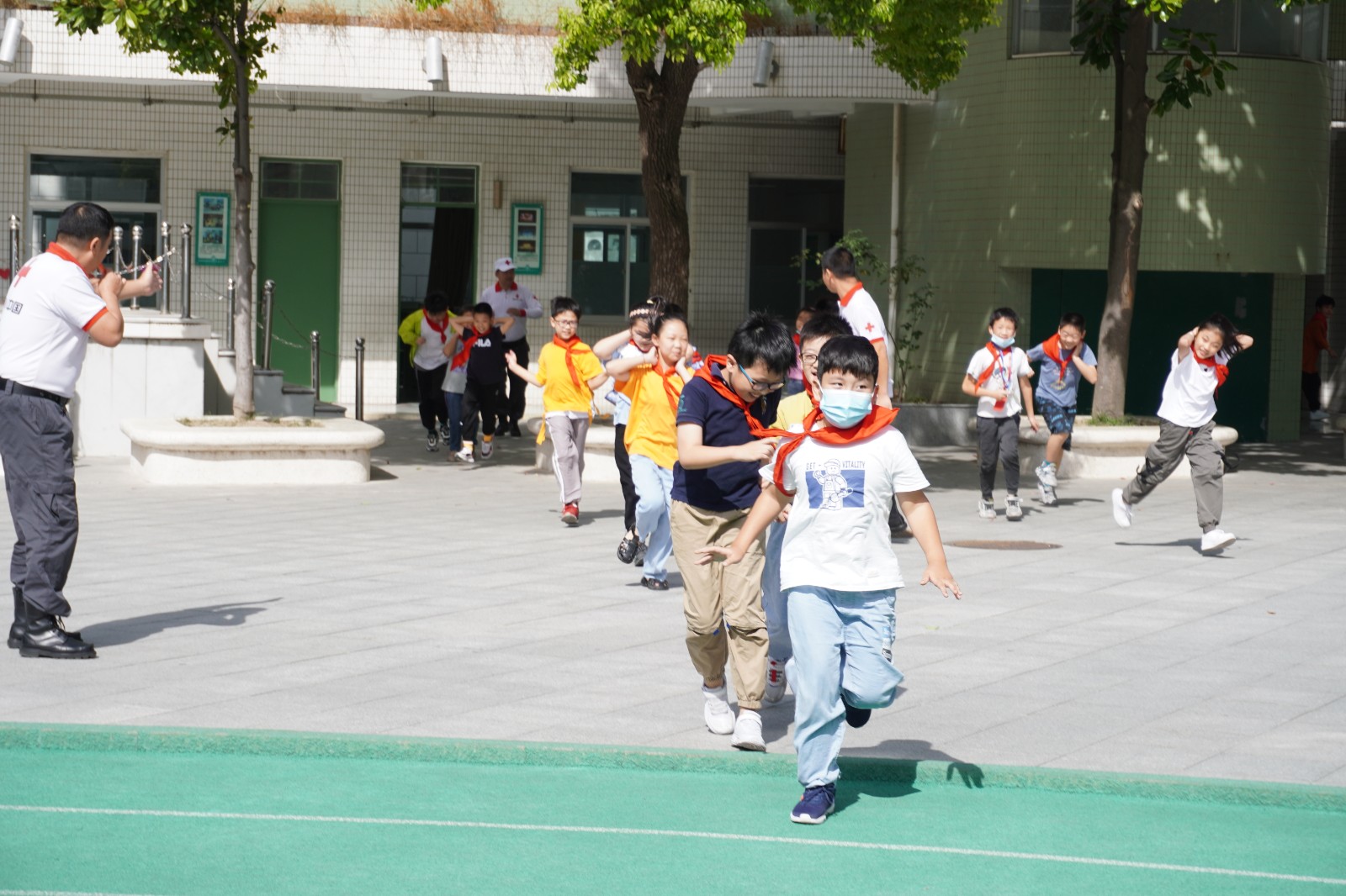 “同学们,地震来临时我们应该怎么办呢?让我们简单演练一下,看看哪位同学做得好。当我们听到第一声哨子,大家就迅速躲到桌下,下蹲抱头并顶厚书本;听到第二声哨子,大家迅速有序撤离教室……”培训老师结合小学生身心发展特点,绘声绘色讲述了地震紧急避险知识,并组织了简单的逃生演练。