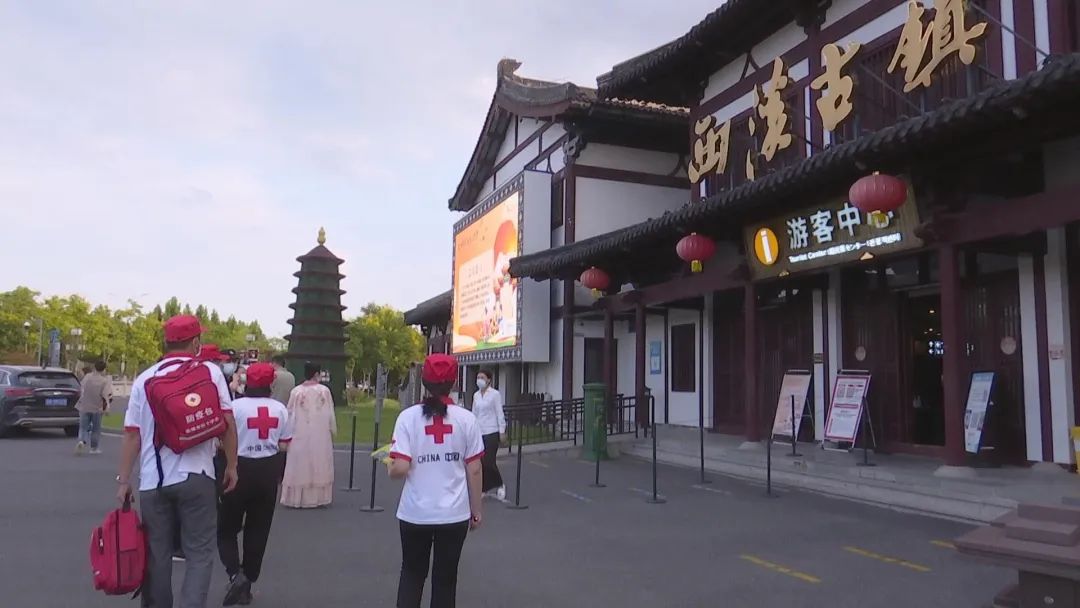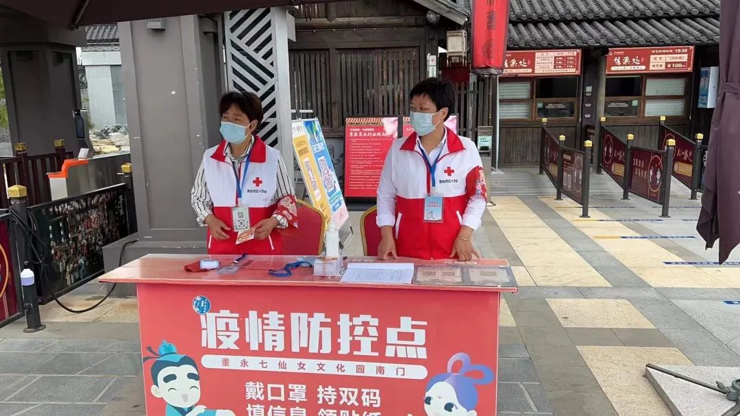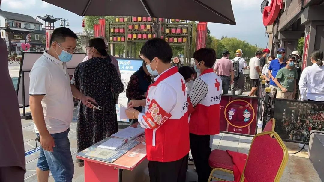 景区红十字救护站志愿者们在景区售票和入口处协助景区工作人员疫情防控引导游客有序购票入园,向游客和景区经营户发放急救手册、造血干细胞等宣传资料,提升了全民救护意识和防护技能,为居民、游客出行提供了安全保障。