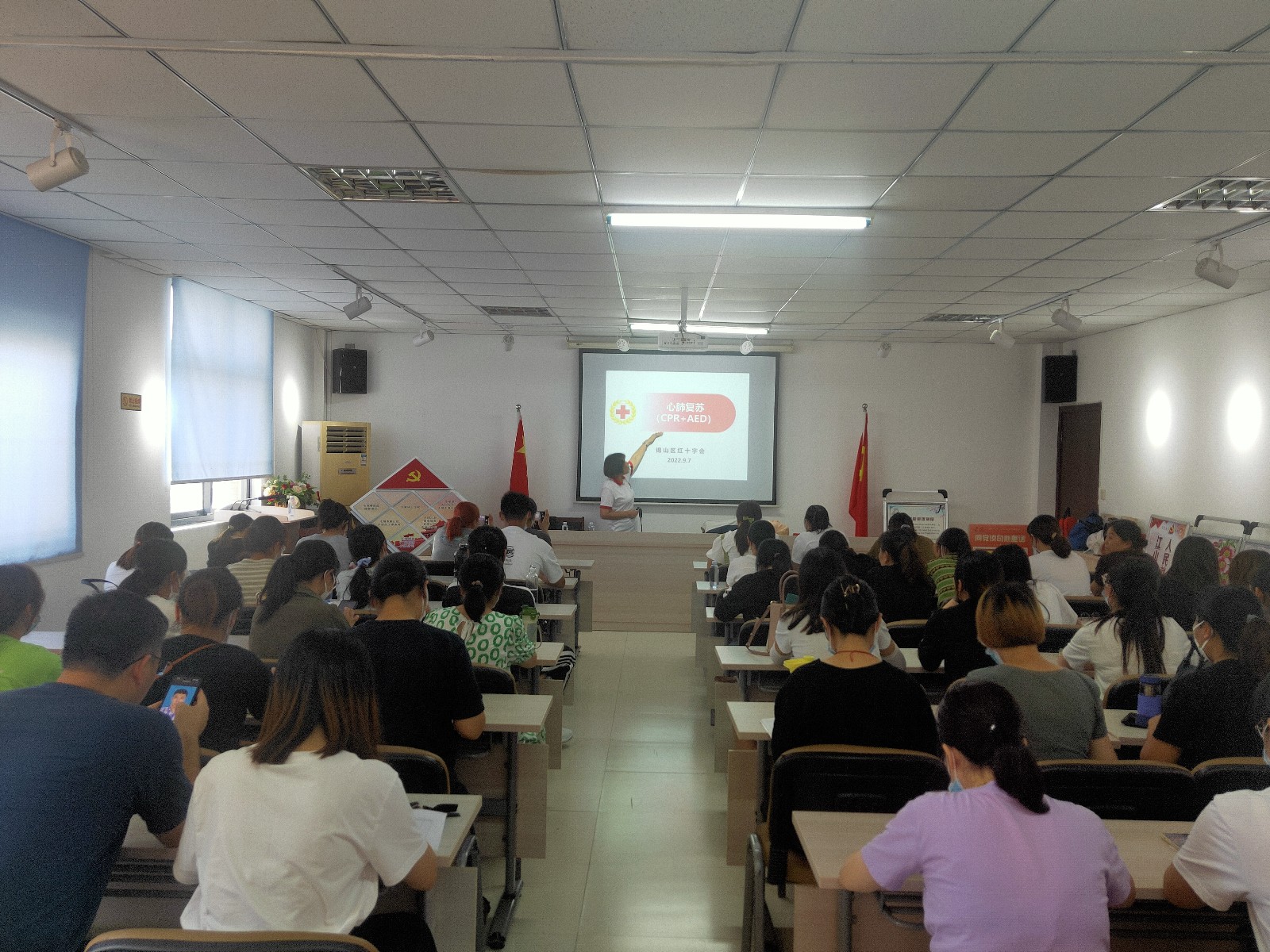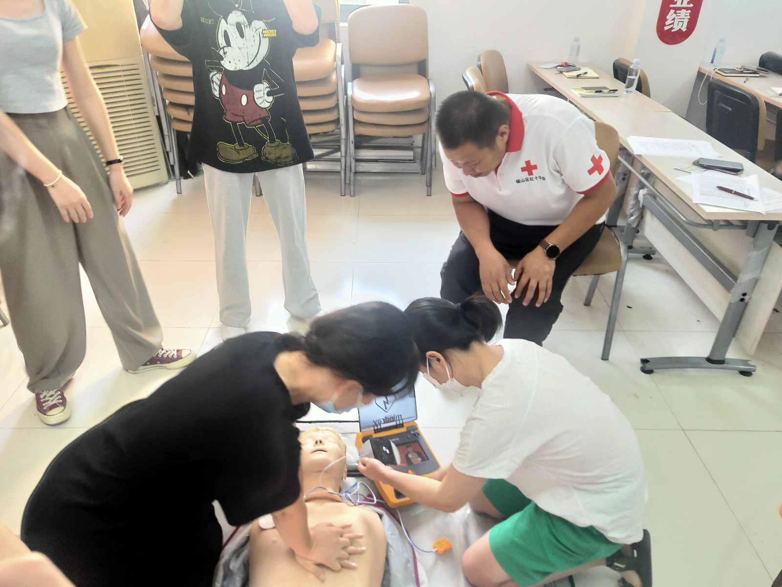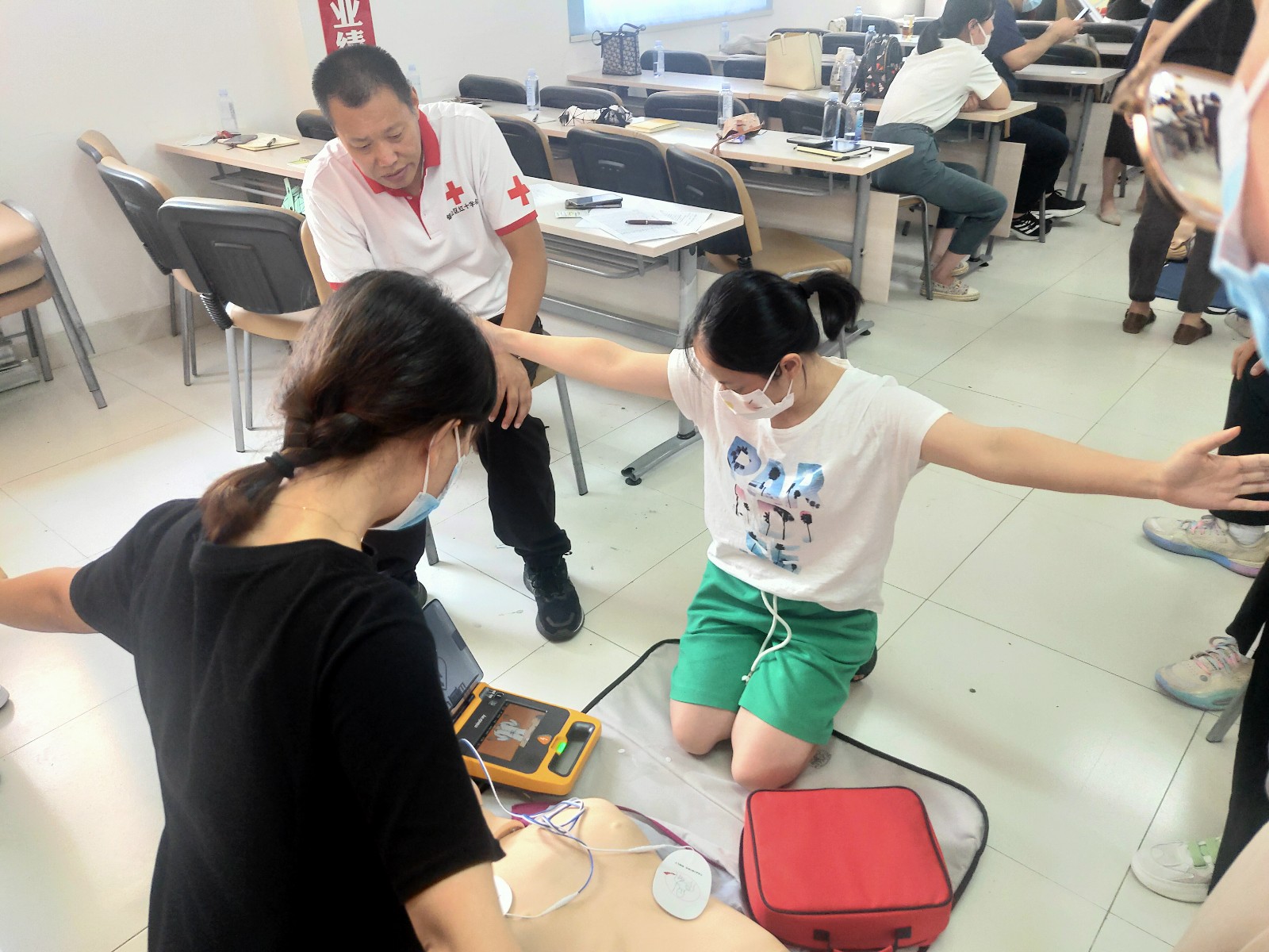 活动开始,红十字会孙老师通过短视频为学员们解答了“什么是急救?为什么要急救?怎样开展急救?”等问题,接着用通俗易懂的语言和真实典型的案例,介绍如何在“黄金四分钟”内正确运用心肺复苏术和AED 除颤仪的使用方法。学员们跃跃欲试,通过老师答疑、亲自操作,进一步巩固了所学知识,掌握了现场急救的基本技能。