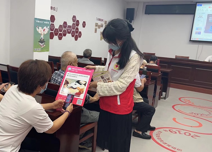 活动开始前,社区红会工作人员提醒大家疫情期间做好防护,接着向居民们发放急救知识宣传手册,随后通过投影授课的方式向居民们详细介绍了火灾逃生、受伤包扎以及生活中老年人容易掌握的急救方法。授课结束后社区红会工作人员还向在场居民宣传了“99公益日”小区共筹AED项目,为南京市心脏骤停的患者筹集728秒抢救时间。