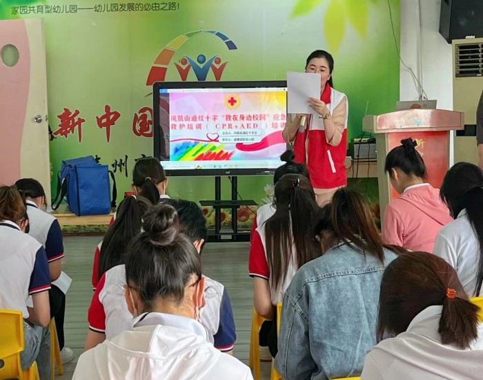 为进一步推进学校应急救护工作,提升教职工健康素养、防灾避险和自救互救技能,掌握必要的急救知识和技能,切实保护师生生命安全和身体健康。9月21日,高港区凤凰街道红十字会走进盛唐实验幼儿园园开展了“救在身边,校园守护”为主题的应急救护心肺复苏(CPR+AED)专项培训活动。