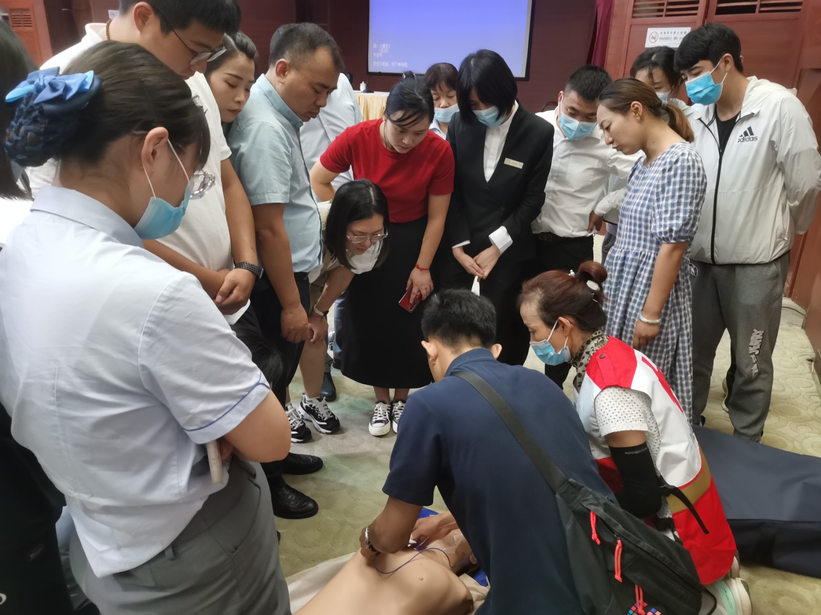 培训现场,清江浦区红十字会应急救护培训老师向学员们普及了AED的重要意义以及AED使用方法。在技能实操课程中,老师们将所有学员分为六组,分别为学员演示和指导AED的使用方法和心肺复苏、海姆立克急救法等具体内容,学员仔细听讲,认真观察,并主动参与互动和模拟练习,形成了良好的互动氛围。