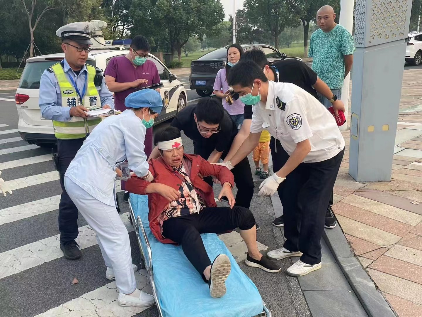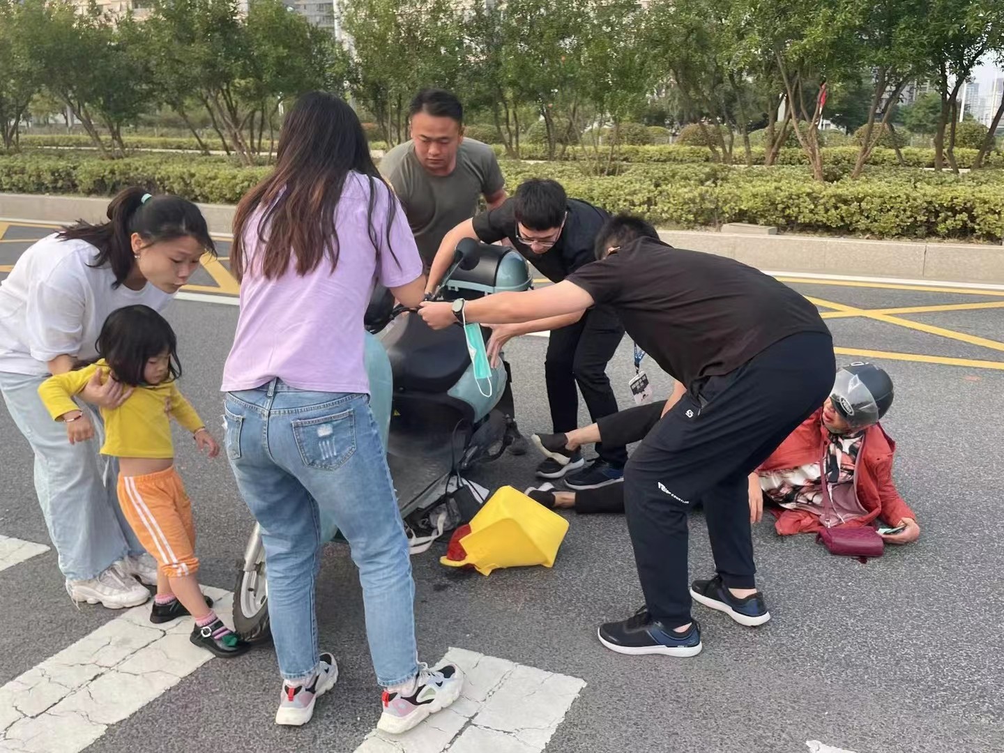 9月29日傍晚,苏州科技城医院药师周振飞驾车带着同事陈峰和黄秋瑞前往参加会议,在路过太湖大道以升路路口的时候发现有一位阿姨倒在地上,身上还压着一辆电瓶车,路边散落的袋子,路边停着的汽车告诉他们,遇到车祸了。