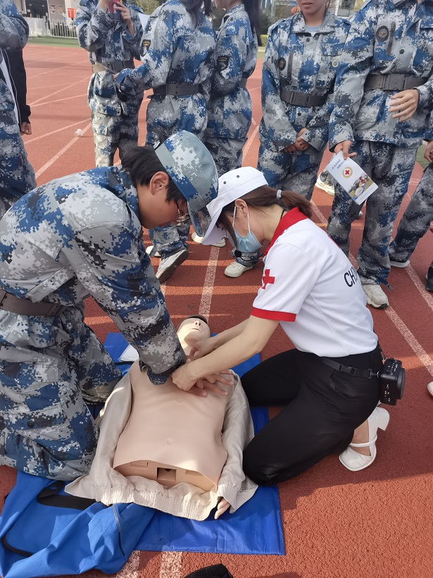 为普及急救知识,提升同学们应对突发事件和意外伤害事故的应急救援和自救互救能力,9月26日,亭湖区红十字会6名志愿者讲师来到盐城生物工程高等职业技术学校,在学校运动场为正在参加军训的2022级全体新生开展应急救护知识宣传和应急救护技能培训。