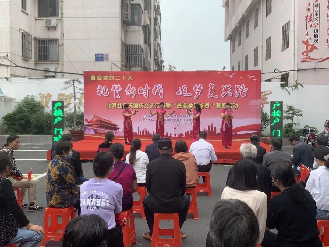9月27日下午,北海社区博爱家园举行庆国庆文艺汇演暨最美微网格员表彰活动。演出在清曲《秦邮城》中拉开帷幕,演员们为现场居民带来了快板、扬剧、情景小品、舞蹈等节目,演出现场气氛欢快,掌声不绝于耳。 此次文艺演出活动精彩纷呈、内容丰富、贴近生活,以居民群众喜闻乐见的方式传递了新时代中国梦精神,让居民乐享文化大餐,同时拉近了与社区居民的距离,促进了和睦互助邻里情,营造了平安、幸福、文明、和谐的良好氛围。