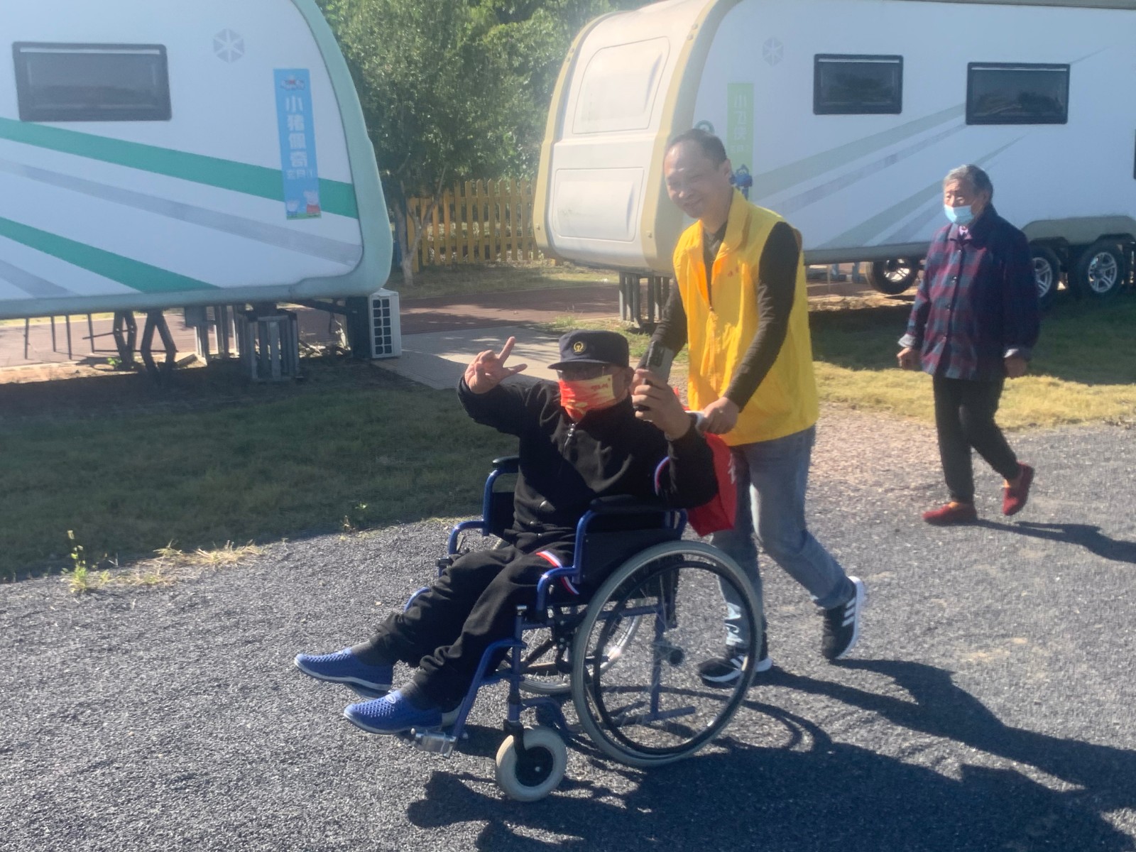 昨天下午1点半,博爱车队的11位志愿者司机载着残障人士和他们的家人,从金山集合出发,一路伴随着江风,欣赏着滨江美景,抵达金山湖国际房车露营地。秋高气爽、阳光明媚,志愿者们推着行动不便的残障人士走在林地小路上,大家难得有机会外出游玩,散步聊天,十分放松。今年24岁的周双蓝和双胞胎妹妹周双霞平日里鲜少出门,这次是玩得不亦乐乎。