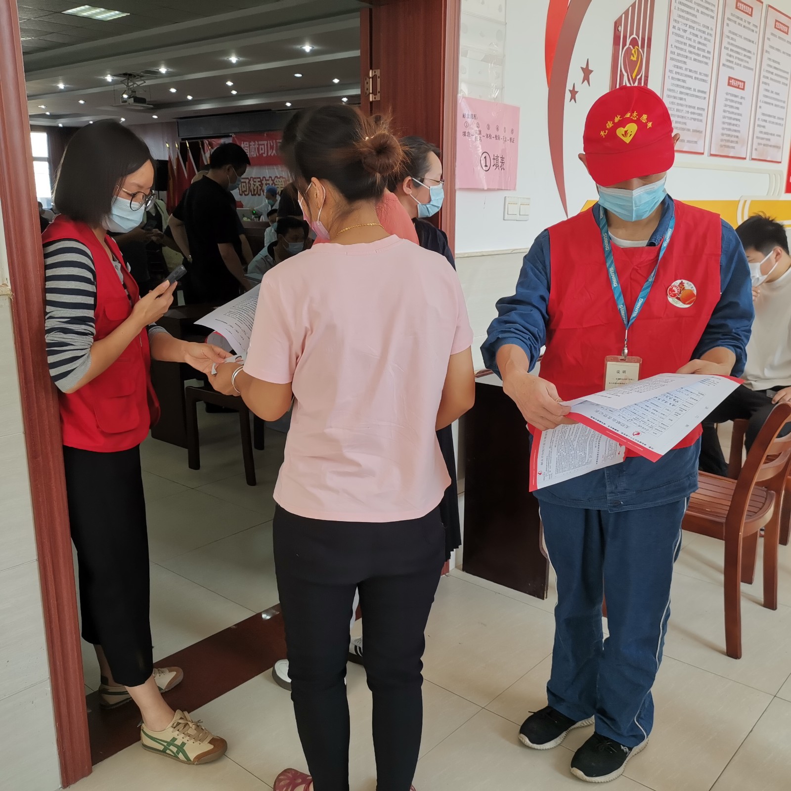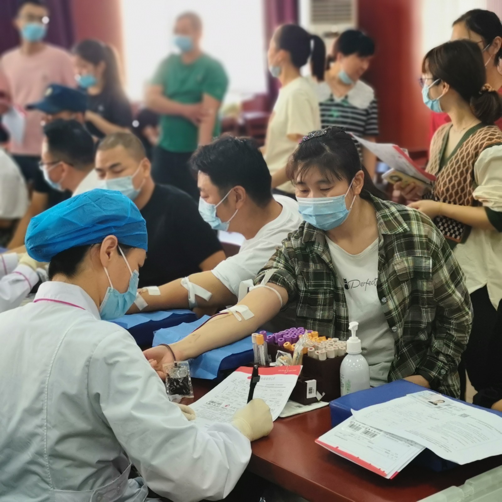 按照上级防疫要求,红十字志愿者们帮助献血者们查验二码,测量体温,活动现场热闹非常。献血者们通过填报登记、体检、化验合格通过后,加入到献血队伍中。