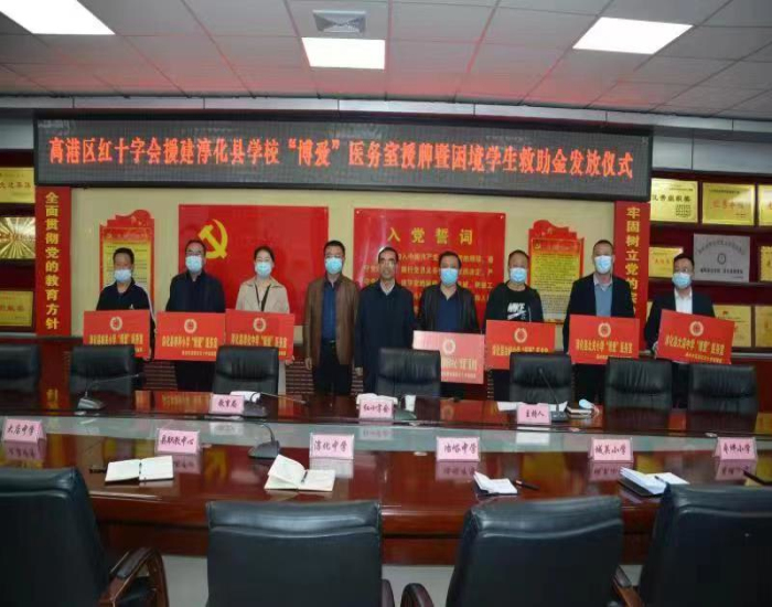 10月18日下午,高港区红十字会援建陕西省咸阳市淳化县中小学“博爱”医务室建设项目授牌暨困境学生救助金发放仪式在淳化县教育局三楼会议室举行。淳化县红十字会负责同志、县教育局相关负责同志、7所学校负责人以及受到救助的15名学生参加了本次活动。